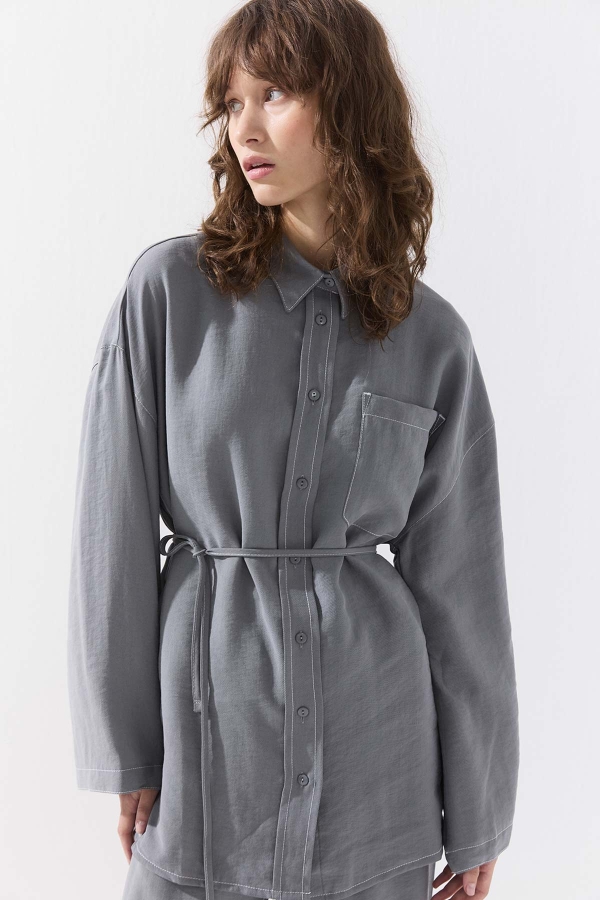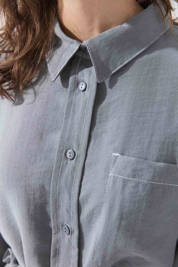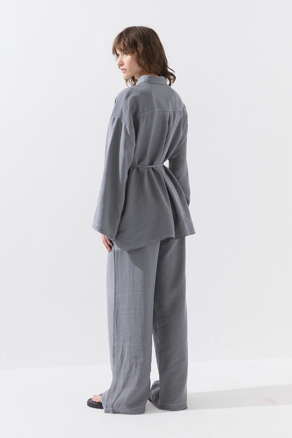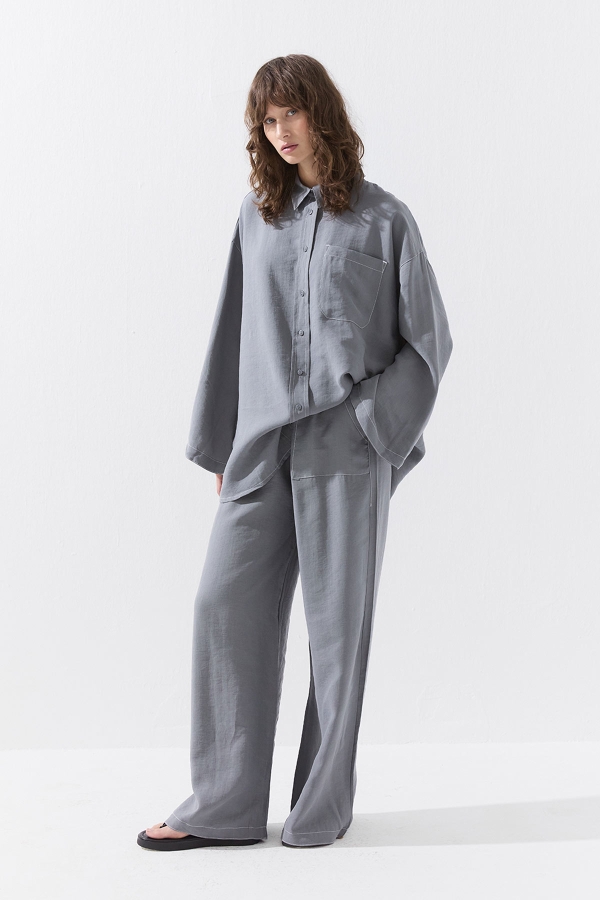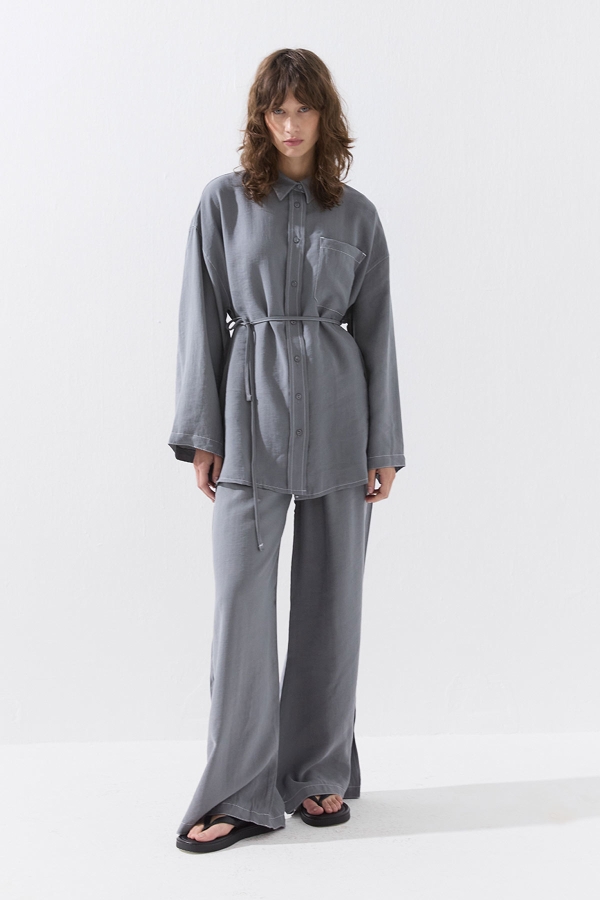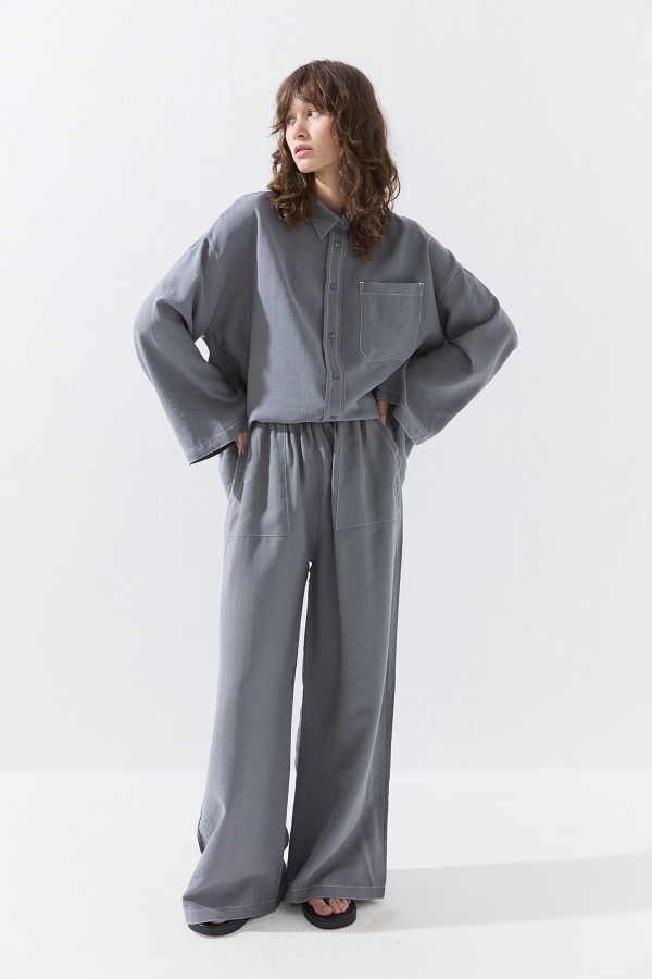 FEATURES OF THE COMFORTABLE GRAY PANTSUIT WITH STITCHING DETAILS: Shirt collar, buttoned, pocket detail, Spanish sleeve style, self-fabric belted waistband, comfortable cut shirt, elastic waist pants, pockets, adjustable drawstring waist, wide leg hem, regular fit, pantsuit with stitching details. Fabric Content and Washing Instructions: 91% Lyocell, 9% Polyester. Wash at maximum 30°C on delicate cycle. Use gentle and delicate programs for washing. Model Wears Size: S. Model Measurements: Height: 1.72 cm, Bust: 78 cm, Waist: 58 cm, Hips: 86 cm