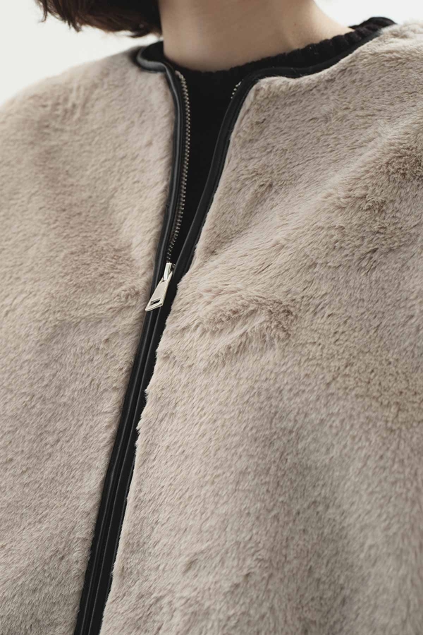 CONTRAST LEATHER TRIMMED FAUX FUR BEIGE COAT FEATURES