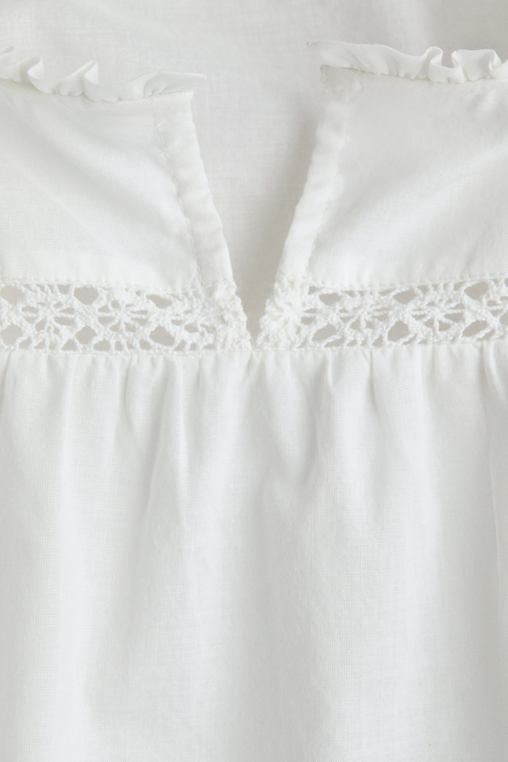 Soft cotton and fine woven fabric blouse with a frilled front. Features a round collar with frills and lace trim, V-neck opening at the front. Long sleeves with covered elastic cuffs.
