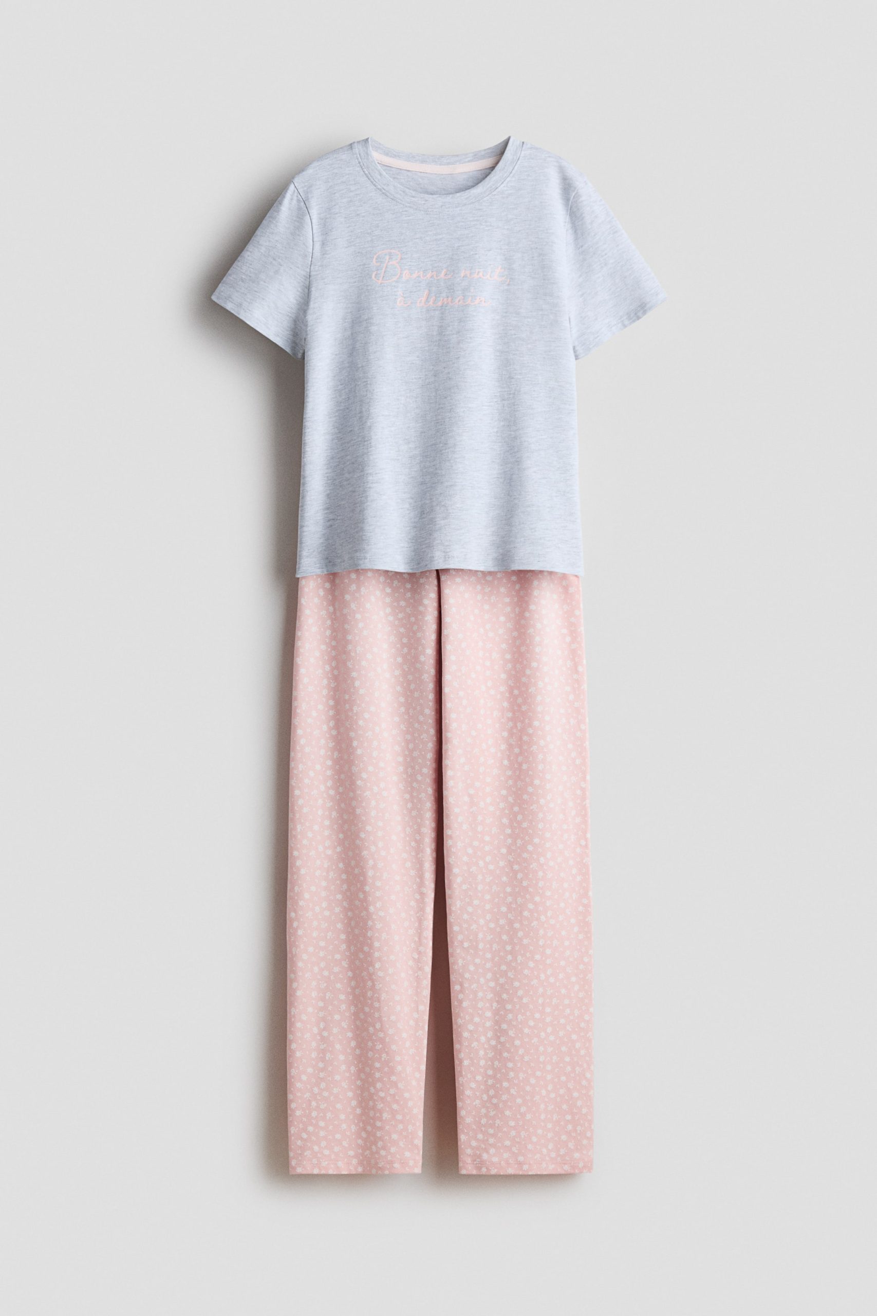 A soft cotton jersey pajama set featuring a printed top and matching bottoms. The top has a round neckline with ribbed trim and short sleeves. The bottoms feature an elastic waistband with covered elastic and straight-leg long pants.