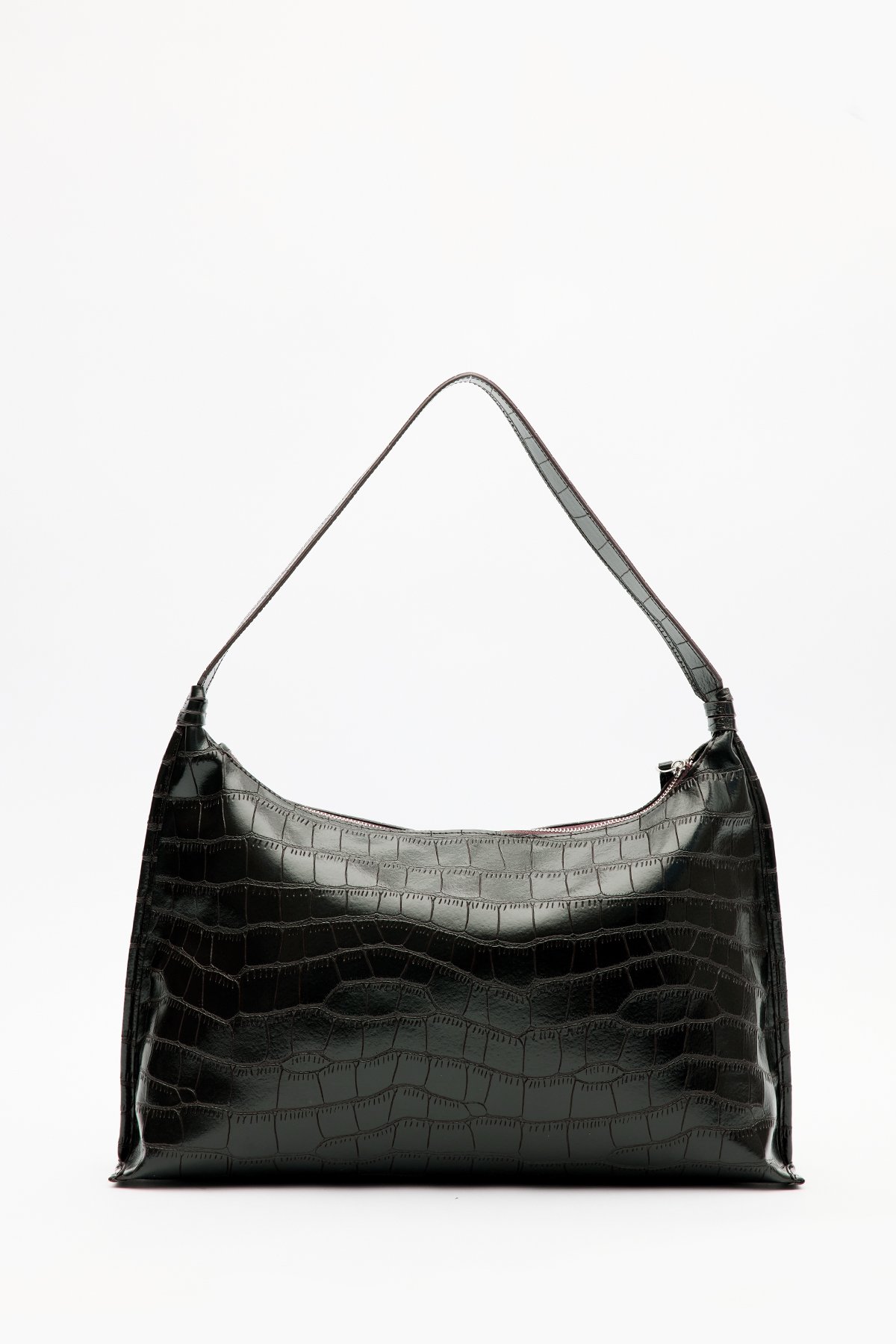 Large-sized tote bag with crocodile-embossed leather look, interior pocket detail, zipper closure, leather lining.