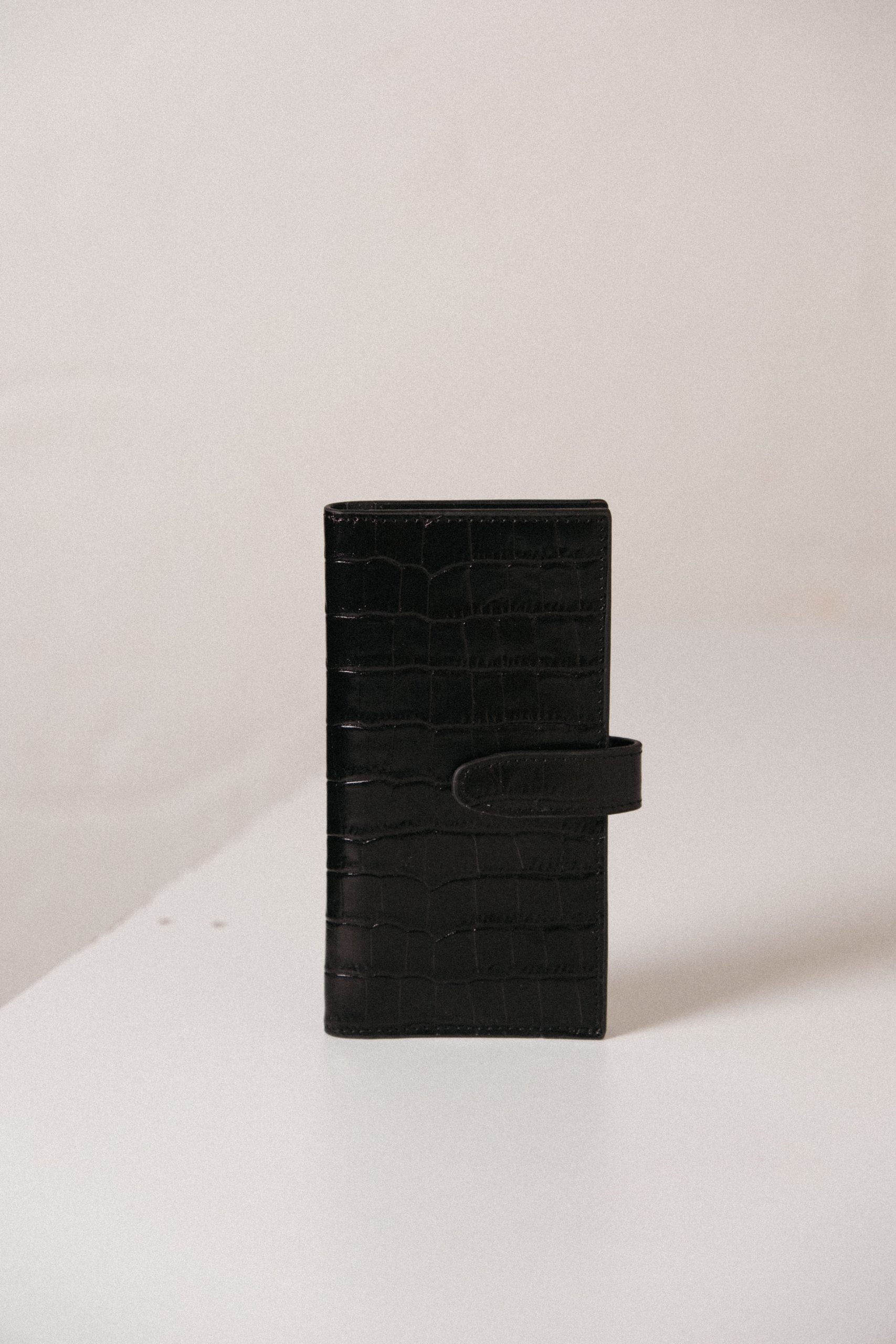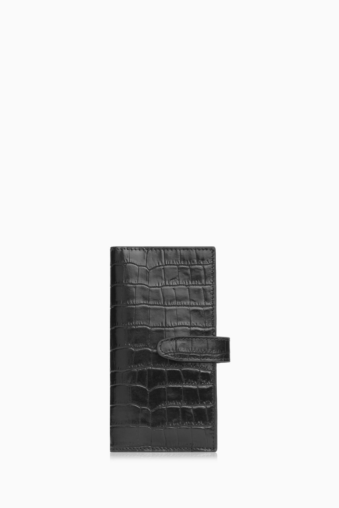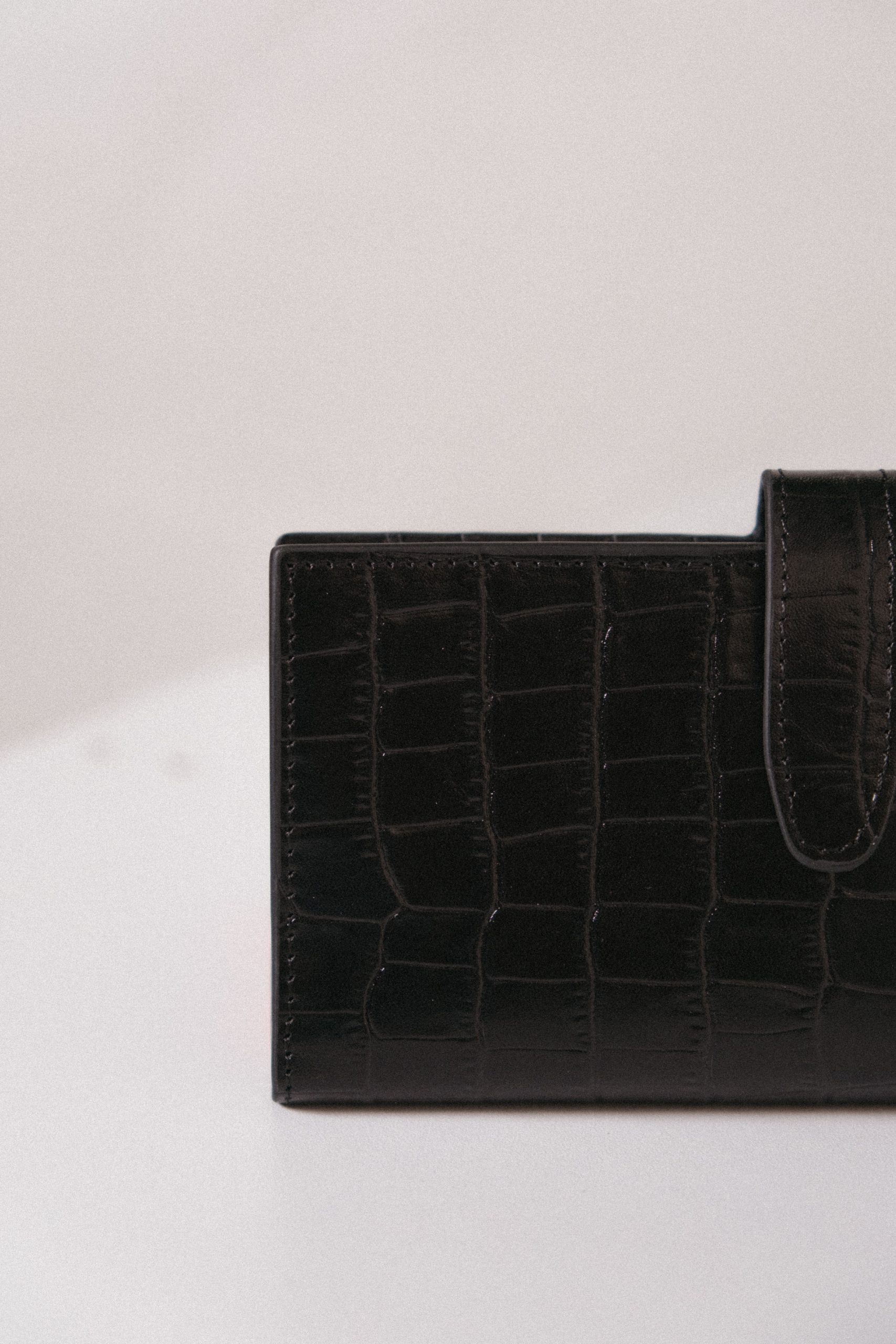 Tags: black wallet, crocodile pattern, leather wallet, luxury accessory, men's accessory, slim wallet