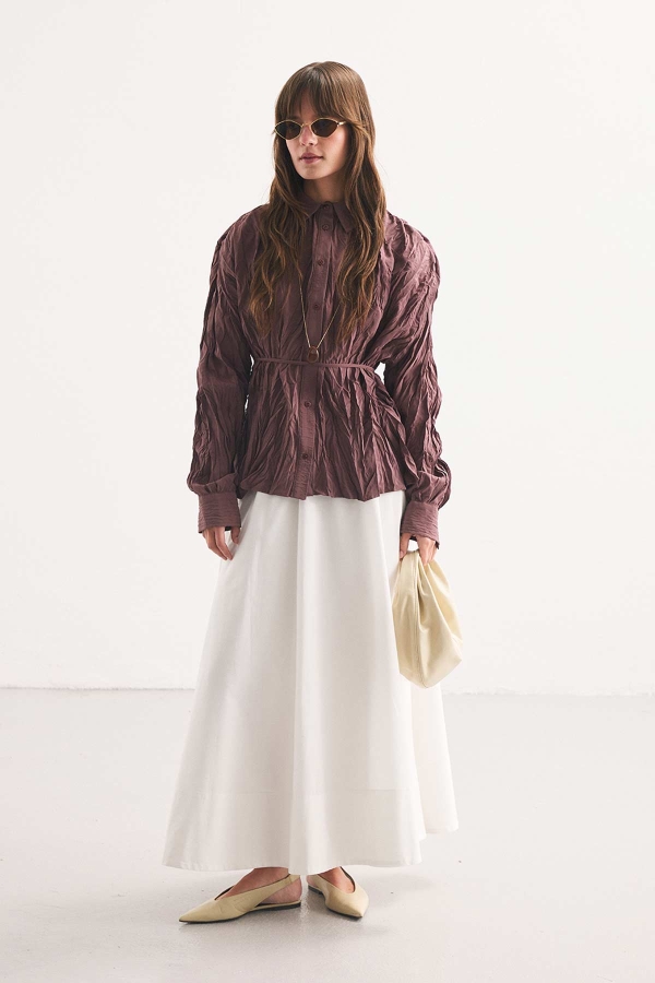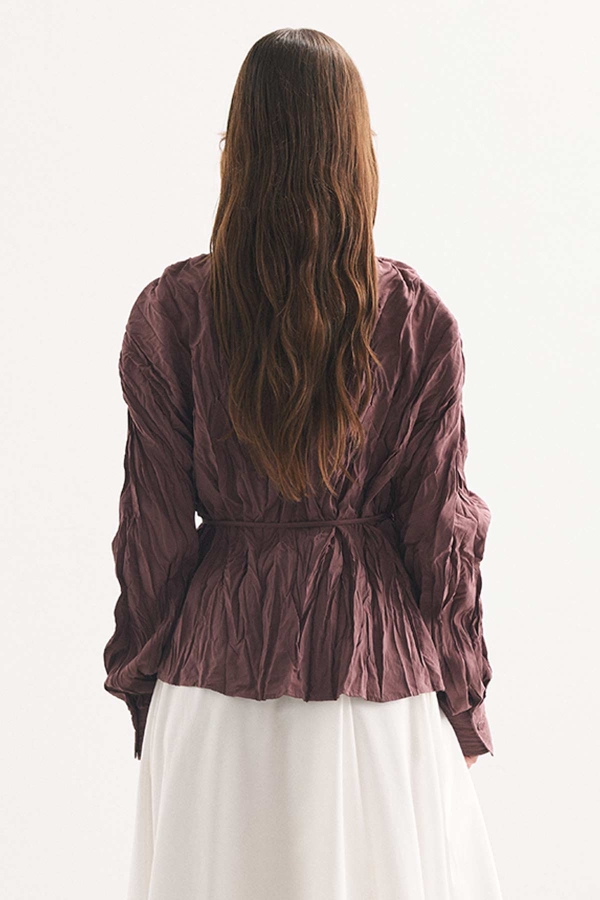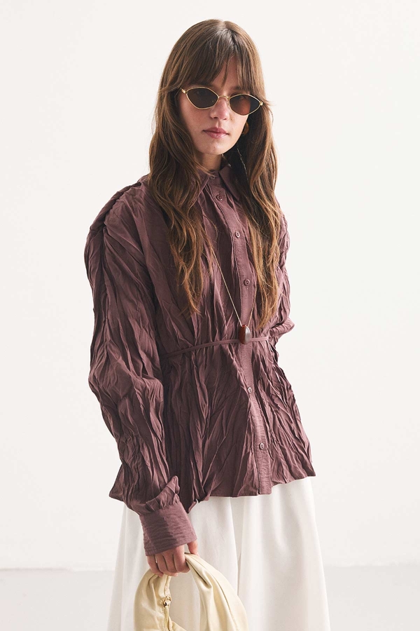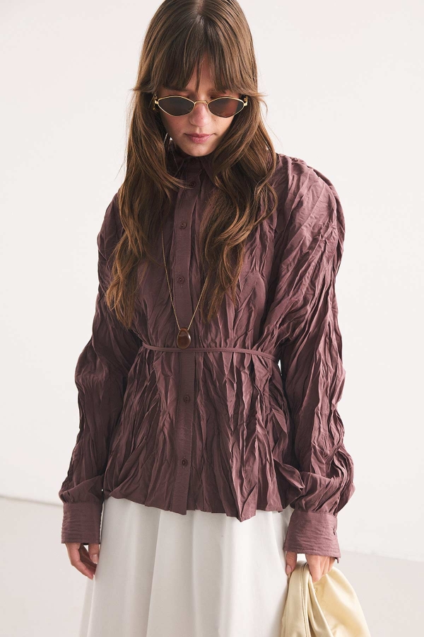 Shirt collar, front button closure, self-fabric tie belt, regular fit, crush texture shirt.