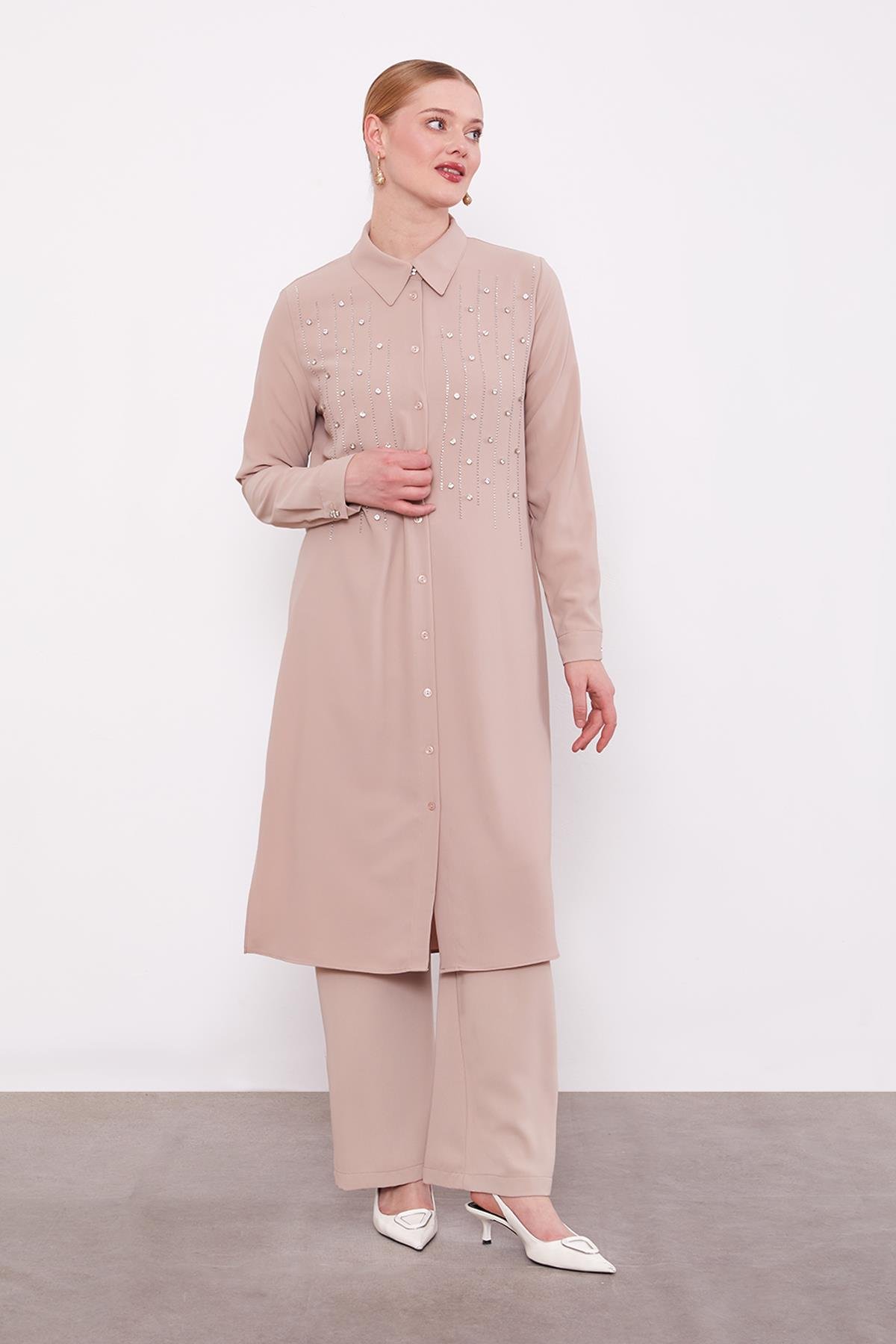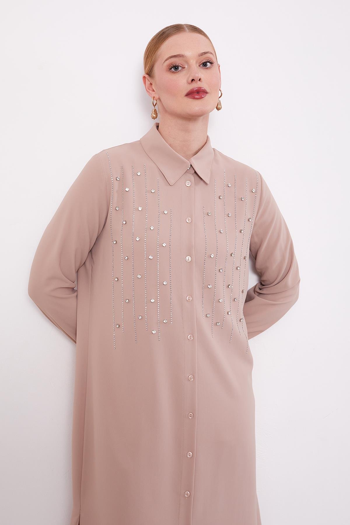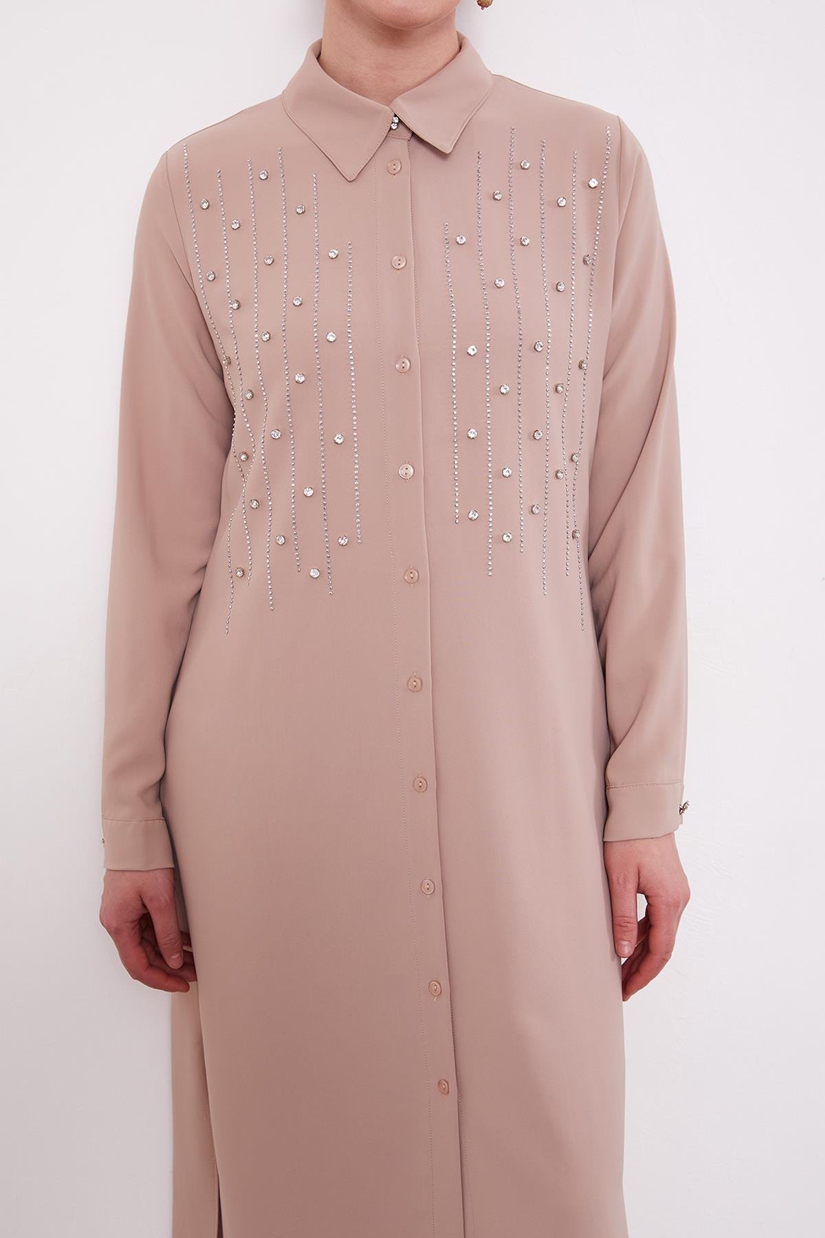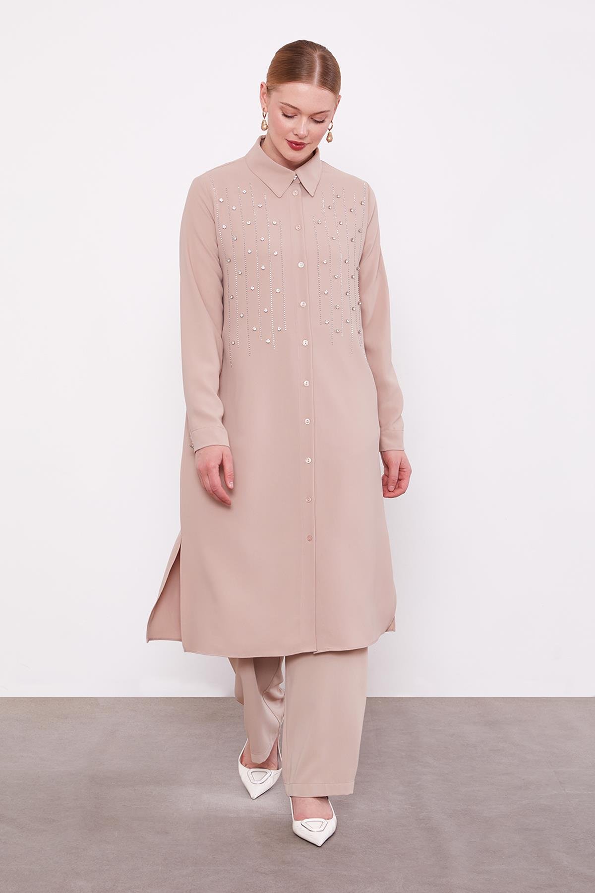 Dark Beige Front Striped Stone Embellished Tunic