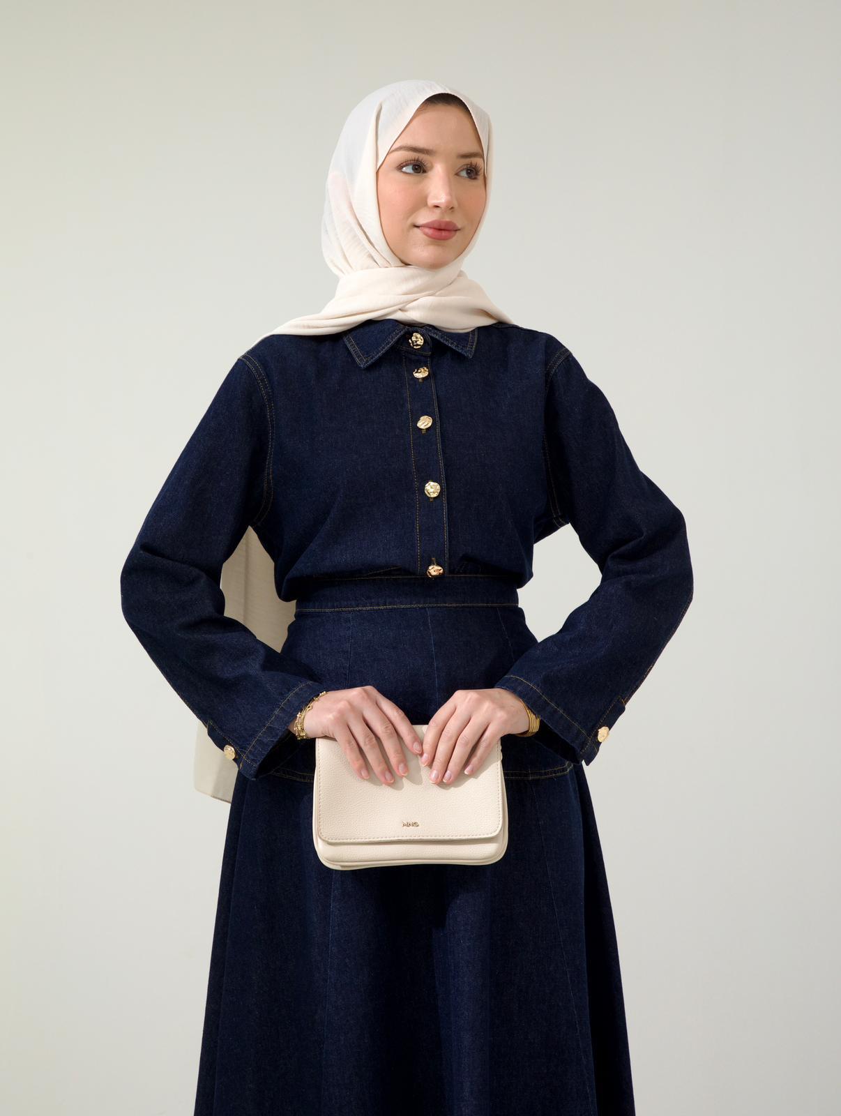 Tags: dark navy, denim set, fashion outfit, jacket skirt combo, matching set