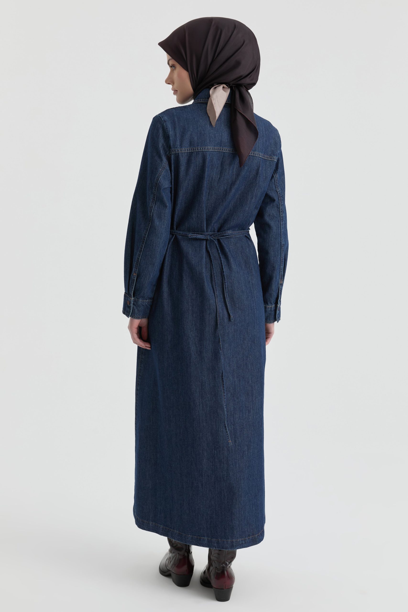 Gömlek yaka formunu denim dokunun güçlü duruşuyla buluşturan bu elbise, rahat siluetiyle günlük stile modern bir yorum katar. Akıcı yapısı gün boyu konfor sunarken, klasik denim görünümü her mevsim kolayca kombinlenebilir