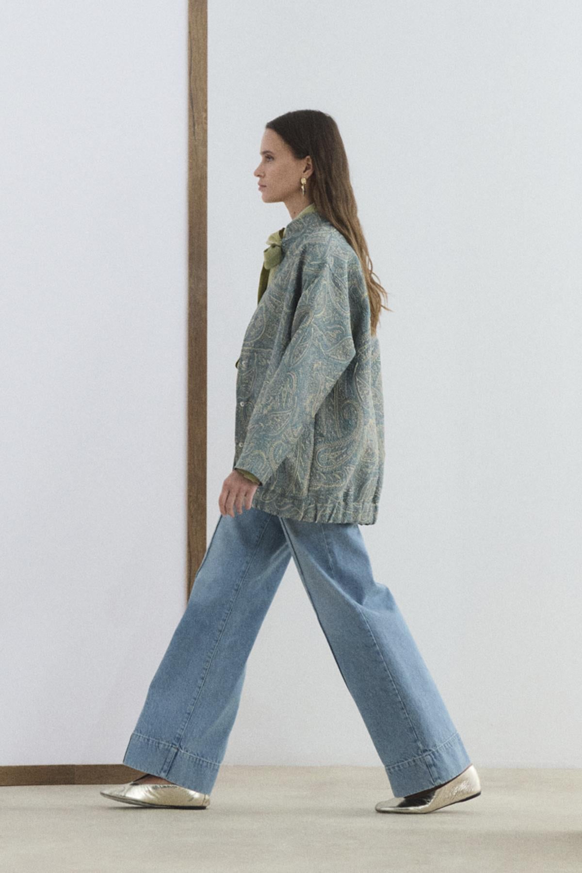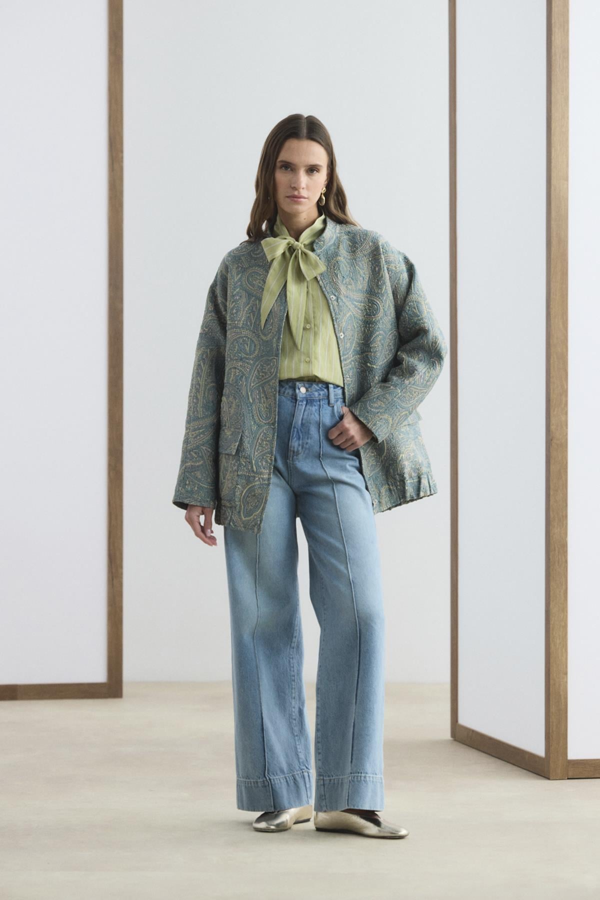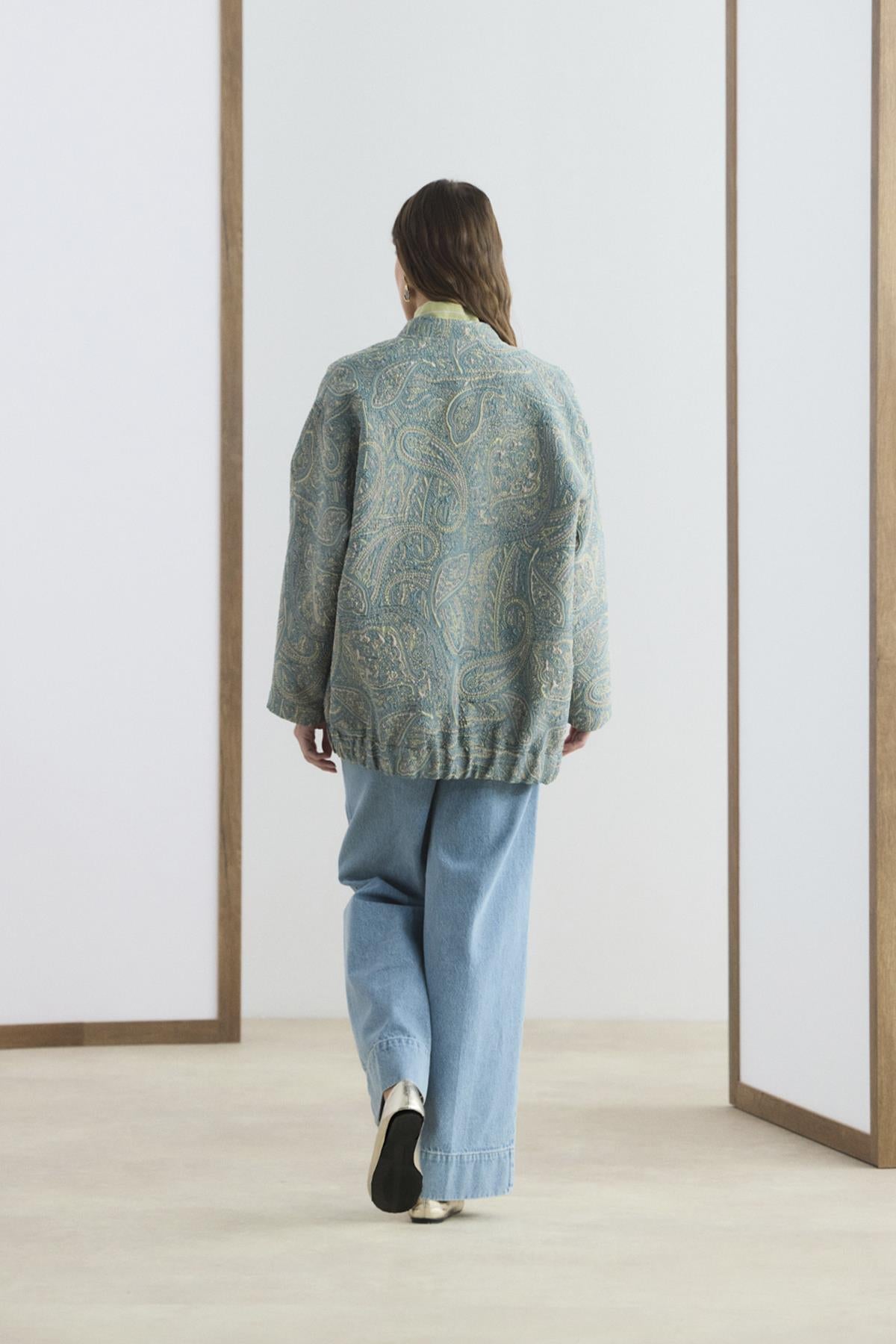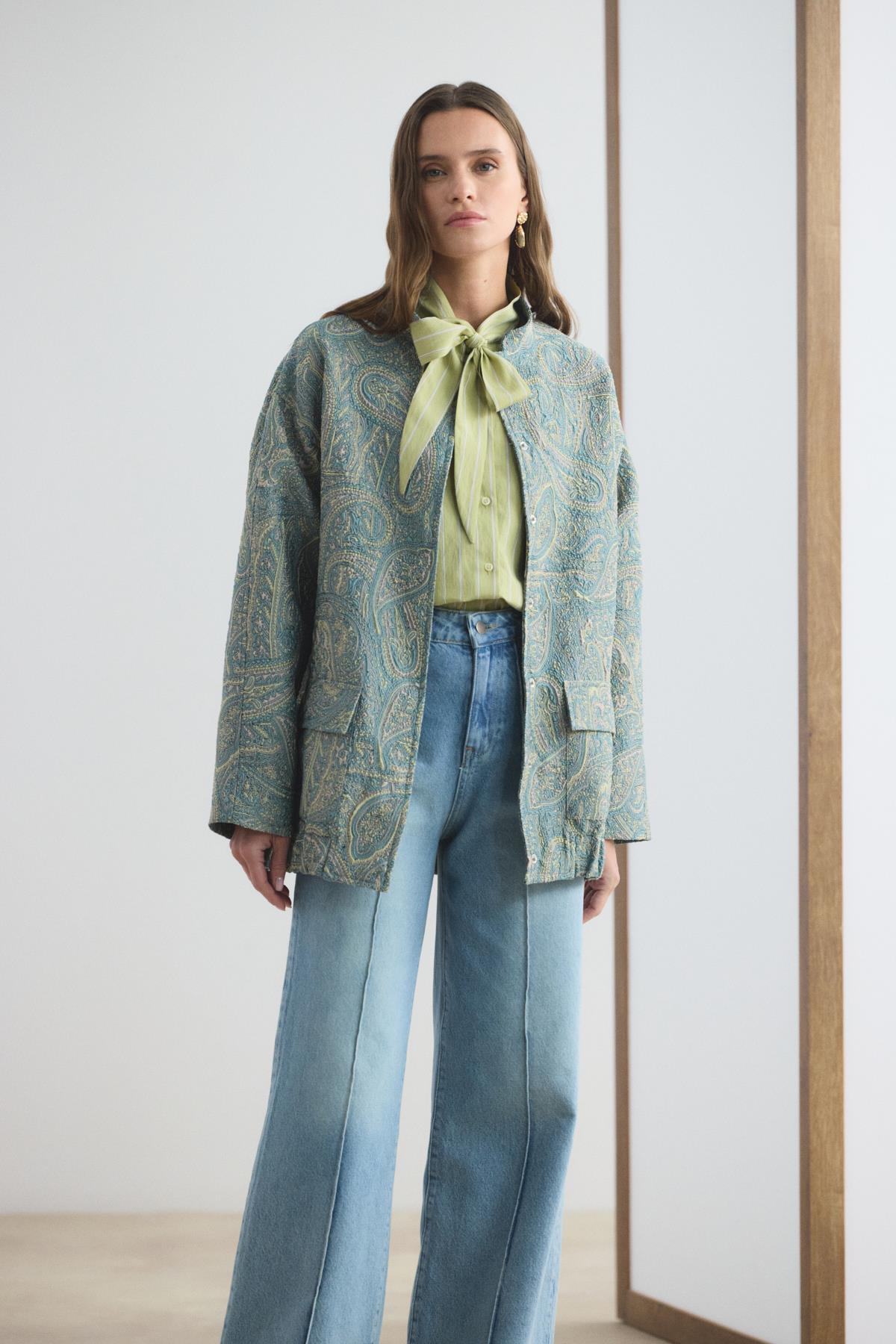 Desenli Jakar Bomber Ceket Uçuk Mavi, özel dokuma kumaşının kendine has dokusu ve desenli tasarımıyla stilinize güçlü bir karakter katar. Dik yaka kesimi ve gizli çıtçıt kapama detayı, ceket tasarımına yalın ve modern bir silüet kazandırır. Etek ucundaki lastik yapısı sayesinde vücut formuna uyum sağlayan ikili takım, işlevsel yan cepleriyle kullanım kolaylığını destekler.