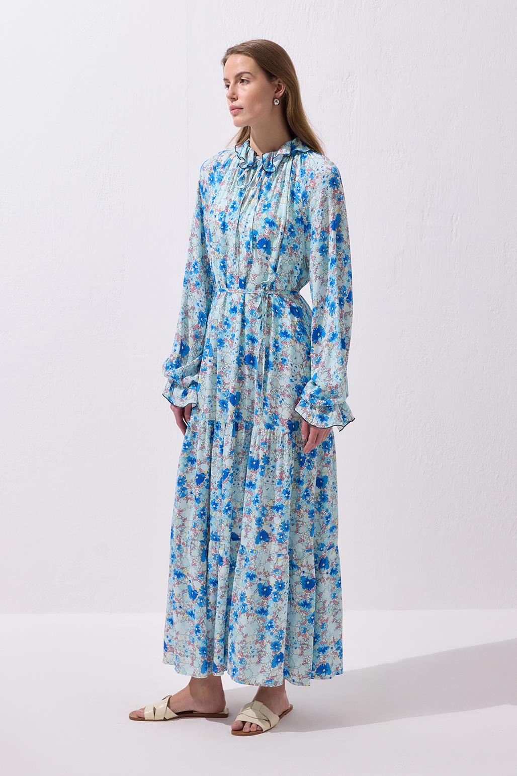 Diane Viscose Ruffled Long Dress Blue
