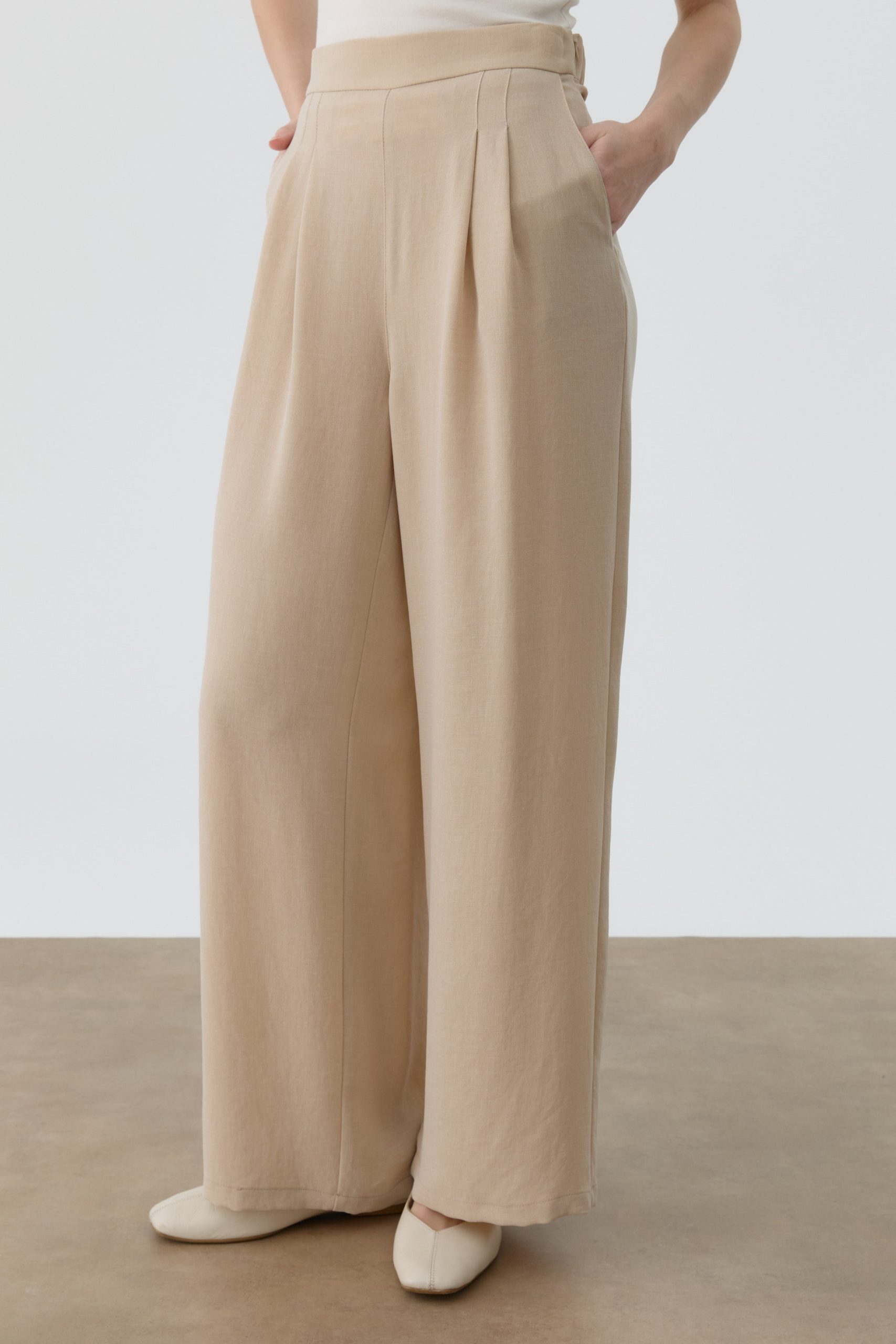 Tags: beige trousers, double pleat trousers, fashion bottoms, high-waist pants, wide leg pants
