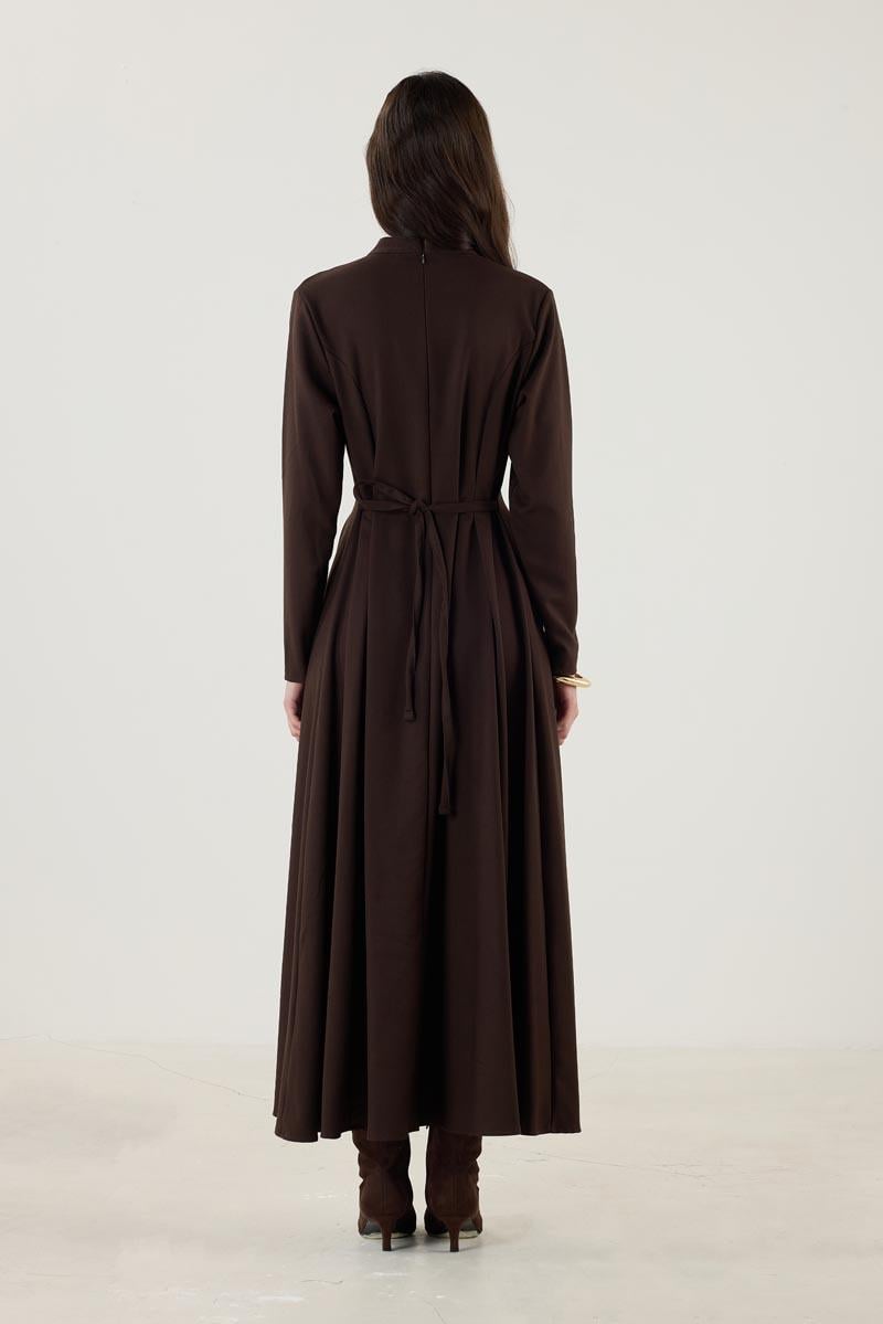 Tags: bitter brown, double pleated, high neck dress, long sleeve, polyester viscose blend, spring collection, true to fit, women's fashion