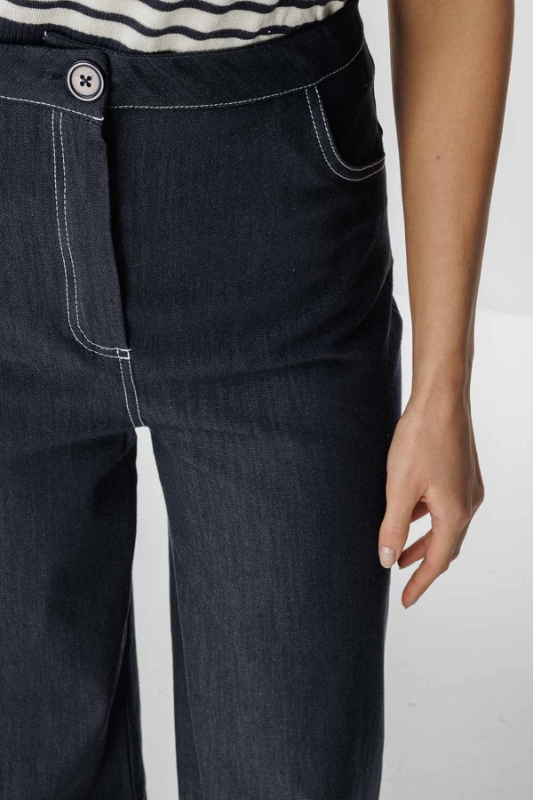 DOUBLE-STITCH DETAIL WIDE-LEG NAVY DENIM TROUSERS FEATURES