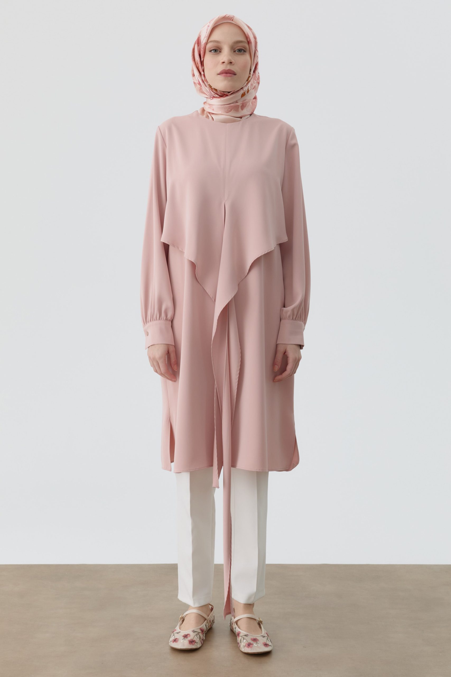 The natural flow of elegance… This tunic, with its belted waist detail and draped structure, gracefully accentuates the body shape, offering an impressive stance despite its minimal appearance.