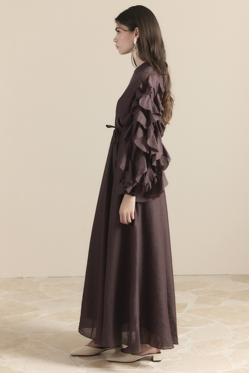This elegant dress features delicate frilled ruffle sleeves that add a feminine touch to your look. Crafted in a rich mulberry color, it’s perfect for special occasions or adding sophistication to your everyday wardrobe. The flowing design ensures comfort while maintaining a stylish appearance.
