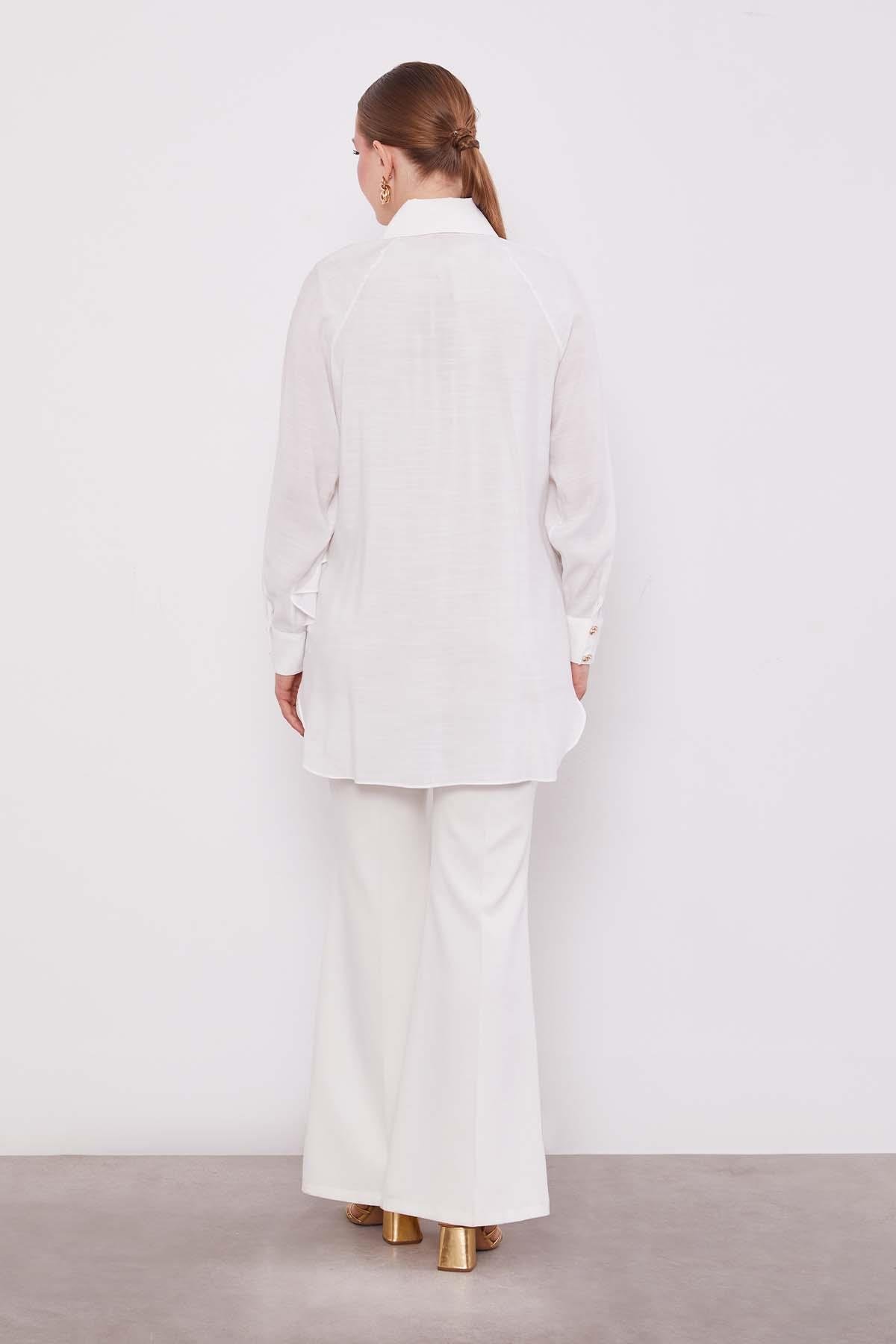 This button-down shirt with detailed buttons adds a sophisticated look to your style with its flowing fabric detail. When paired with a patterned silk scarf, it draws attention in any setting. Its length allows comfortable wear with slim pants and leggings. The ruffle detail running from under the shoulder to the cuff adds elegance and chicness. Our shirt, available in different colors, can be chosen for daily wear or special occasions.