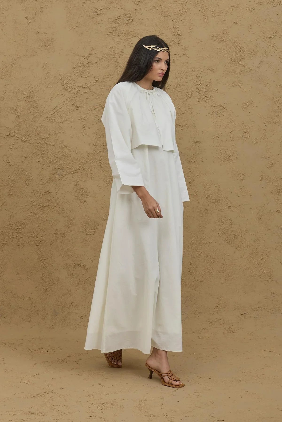 Made from 100% cotton voile fabric, this set features a crop jacket with wide sleeves and a front tie, accompanied by a thick-strapped dress with a zippered back closure.