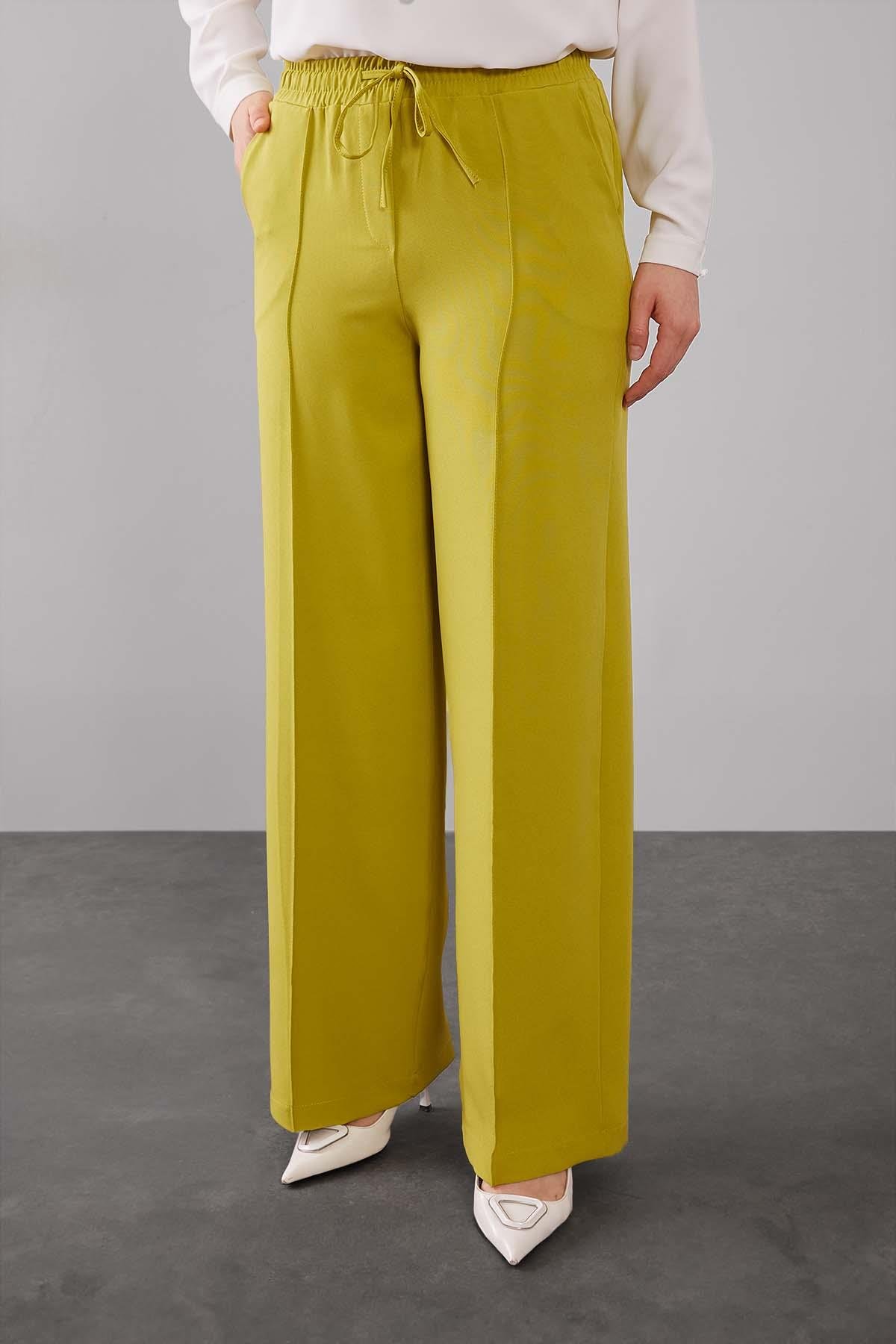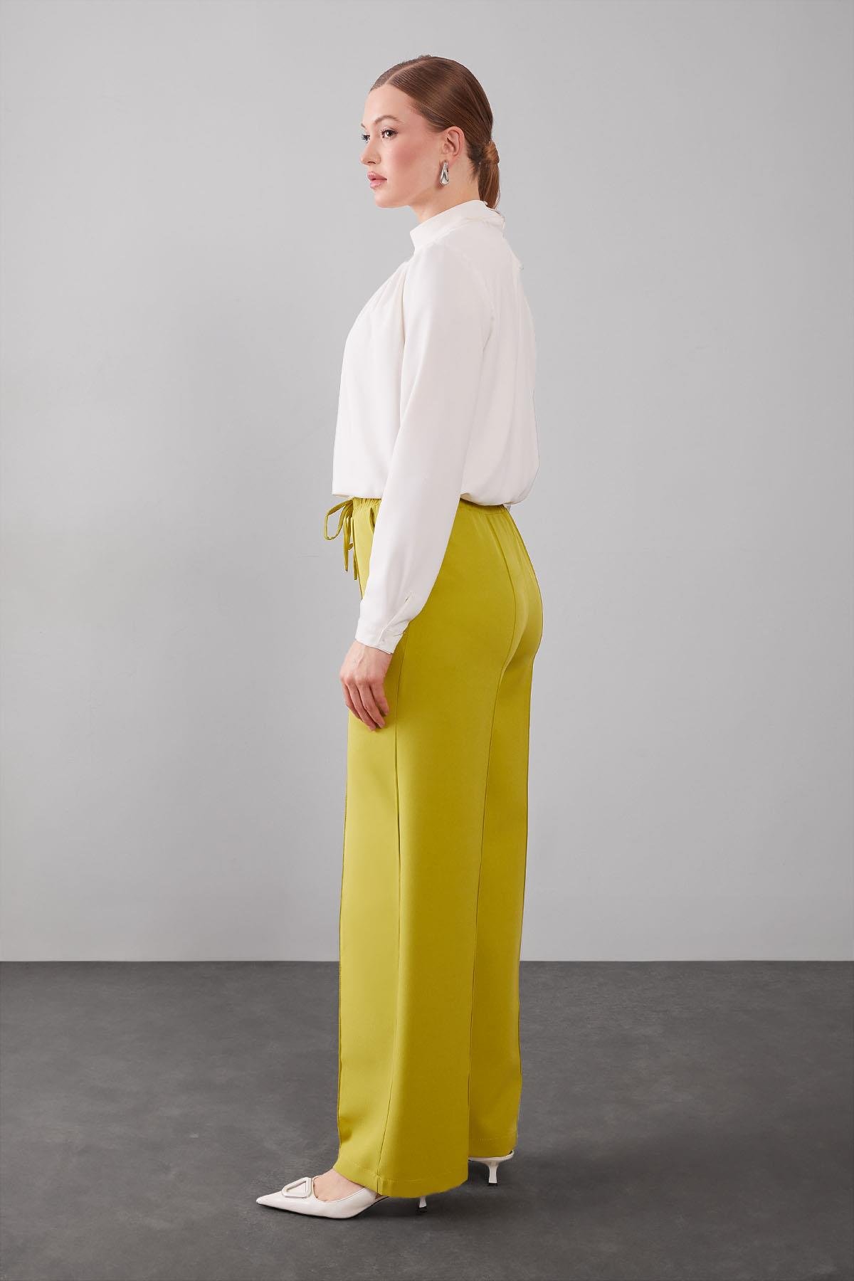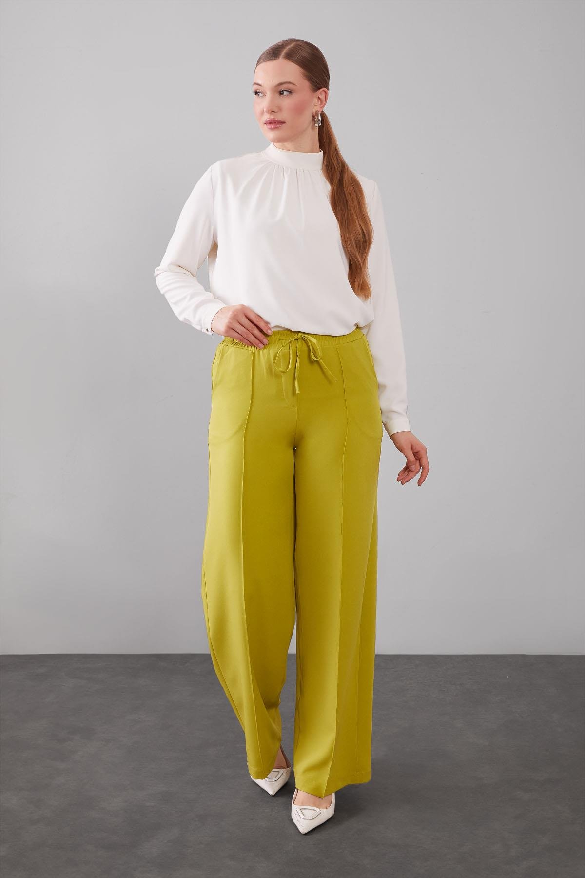 CARE INSTRUCTIONS: Wash our product inside out on a delicate cycle. Use liquid detergent and spin at low speed. Dry flat and iron at low temperature. EDITOR’S COMMENT: The elastic waist rib-stitched trouser model allows for comfortable wear thanks to its elastic waistband. The rib-stitch details create a modern look, distinguishing it from classic trousers. Our elastic waist ribbed trousers can be used in both sporty and casual combinations and can be easily paired with t-shirts, sweatshirts, or elegant blouses. Especially in autumn and winter, the thicker fabric versions keep you warm without sacrificing style. The palazzo cut creates the effect of making your legs appear longer. It offers versatile pairing opportunities that easily match with both sneakers and high-heeled shoes. — Technical Details — Fabric: Satin Pattern: Plain Model Measurements: Height: 174 cm, Chest: 87 cm, Hips: 100 cm, Sleeve Length: 60 cm Waist: Elastic Fabric Type: Polyester Pocket Type: Pockets