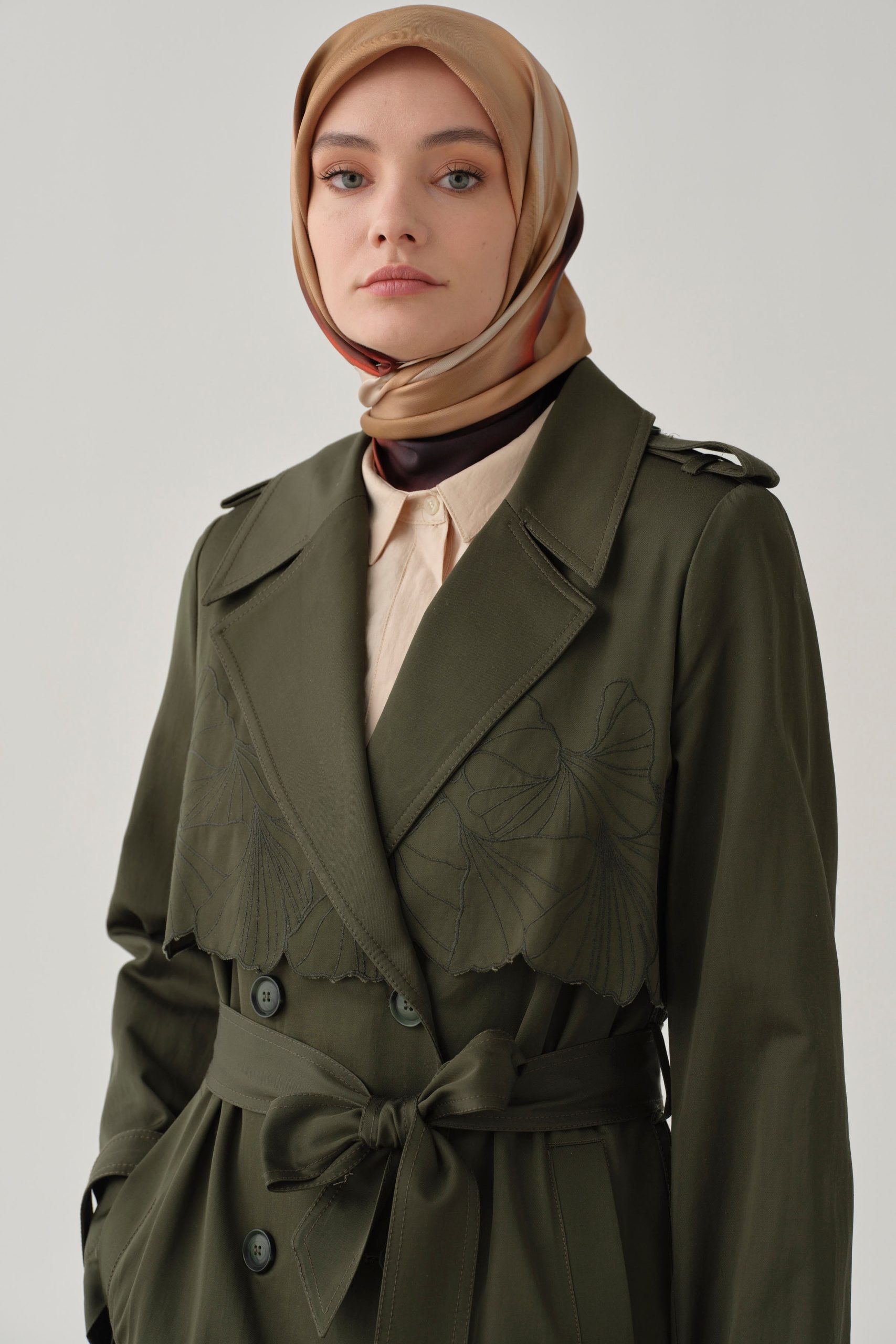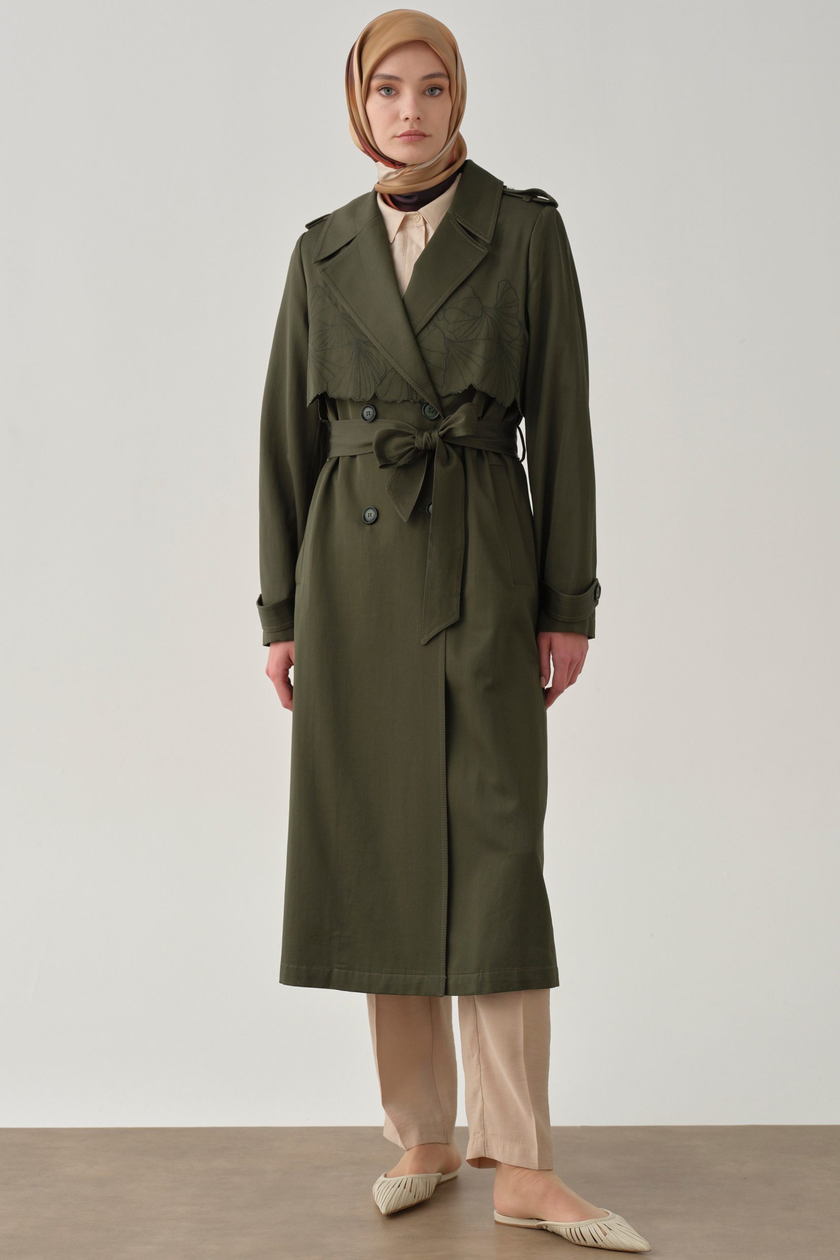 This trench coat stands out with its elegant embroidery and chic windbreaker details, blending classic design with modern touches. Its lightweight and fluid structure ensures comfortable wear, while the embroidery adds a sophisticated flair.