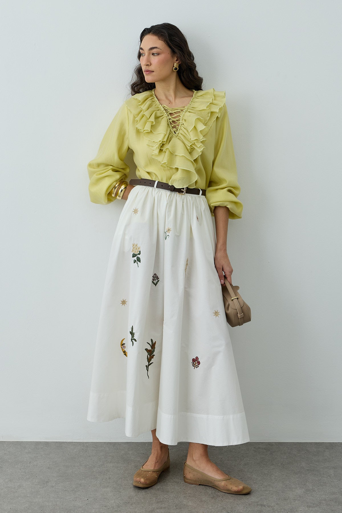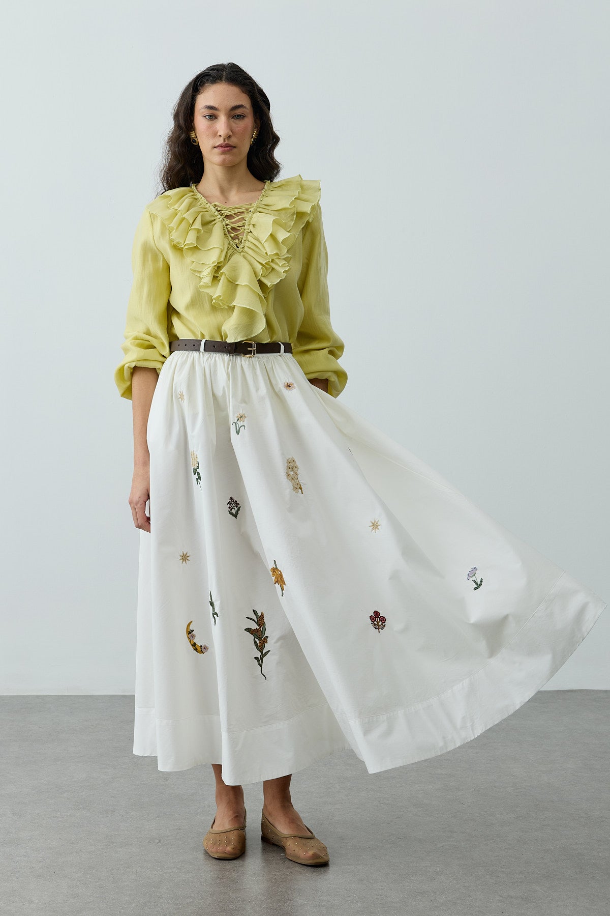 Maxi skirt made from 100% cotton woven fabric, featuring a thin waistband, gathered design, embroidered details, and thick pleats at the hem.