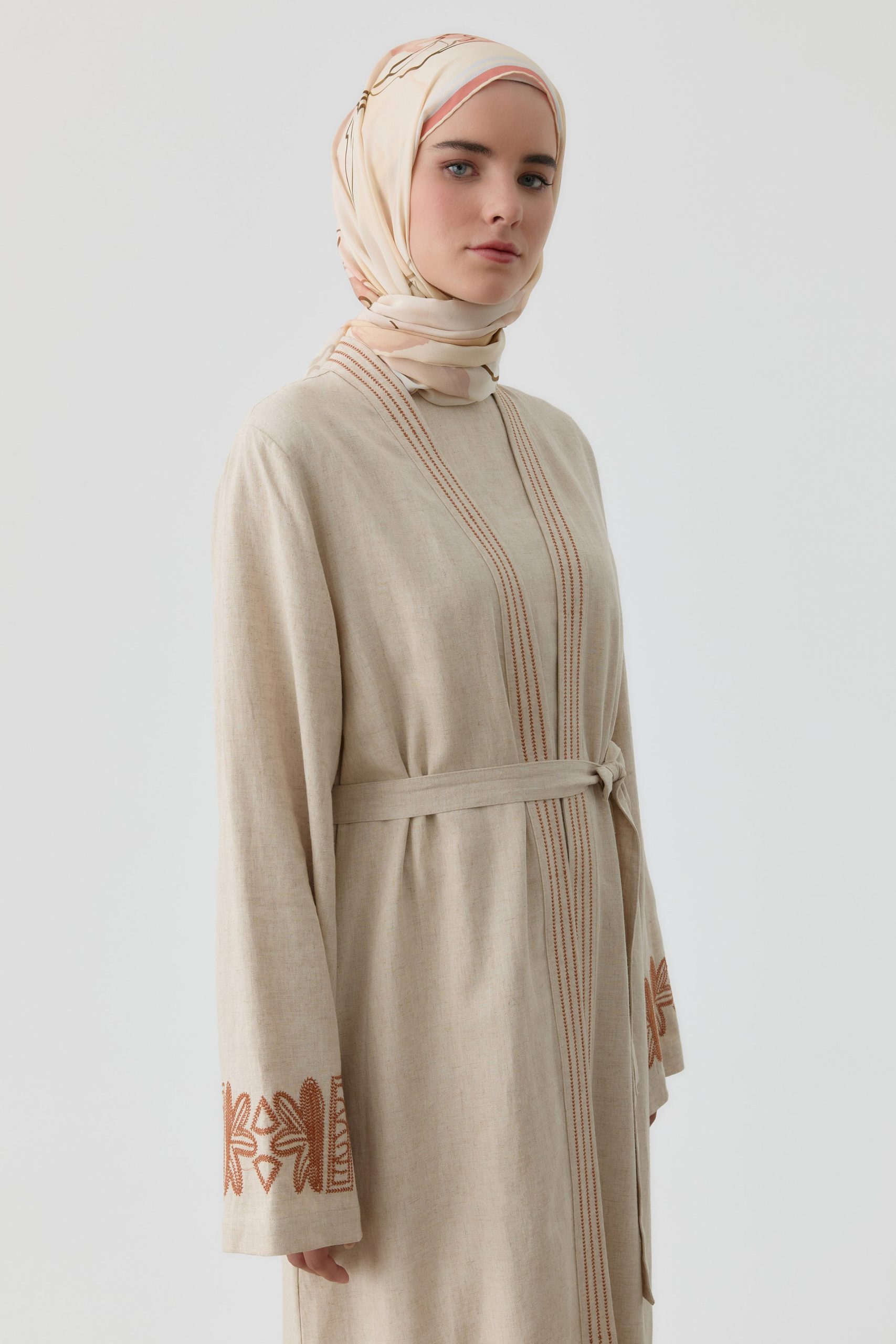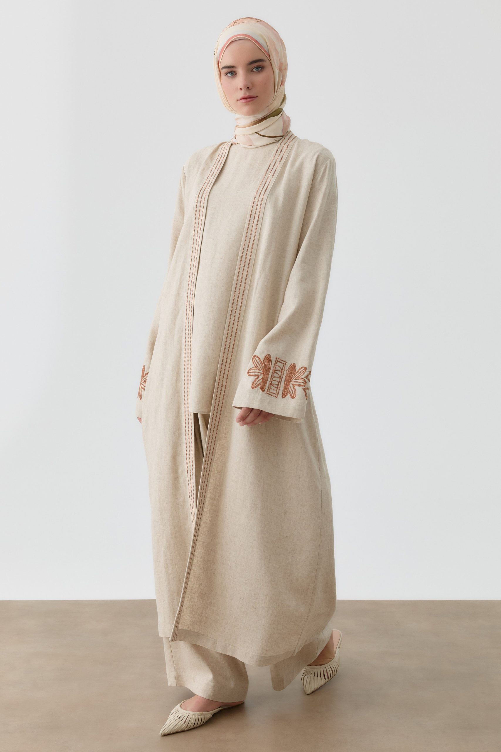 This kimono set, enriched with delicate embroidery details, offers a sophisticated and feminine look. Its comfortable cut ensures all-day comfort while the matching pieces provide easy styling versatility. The embroidery craftsmanship adds a handmade touch to the set, and the fluid fabric creates a dynamic silhouette.