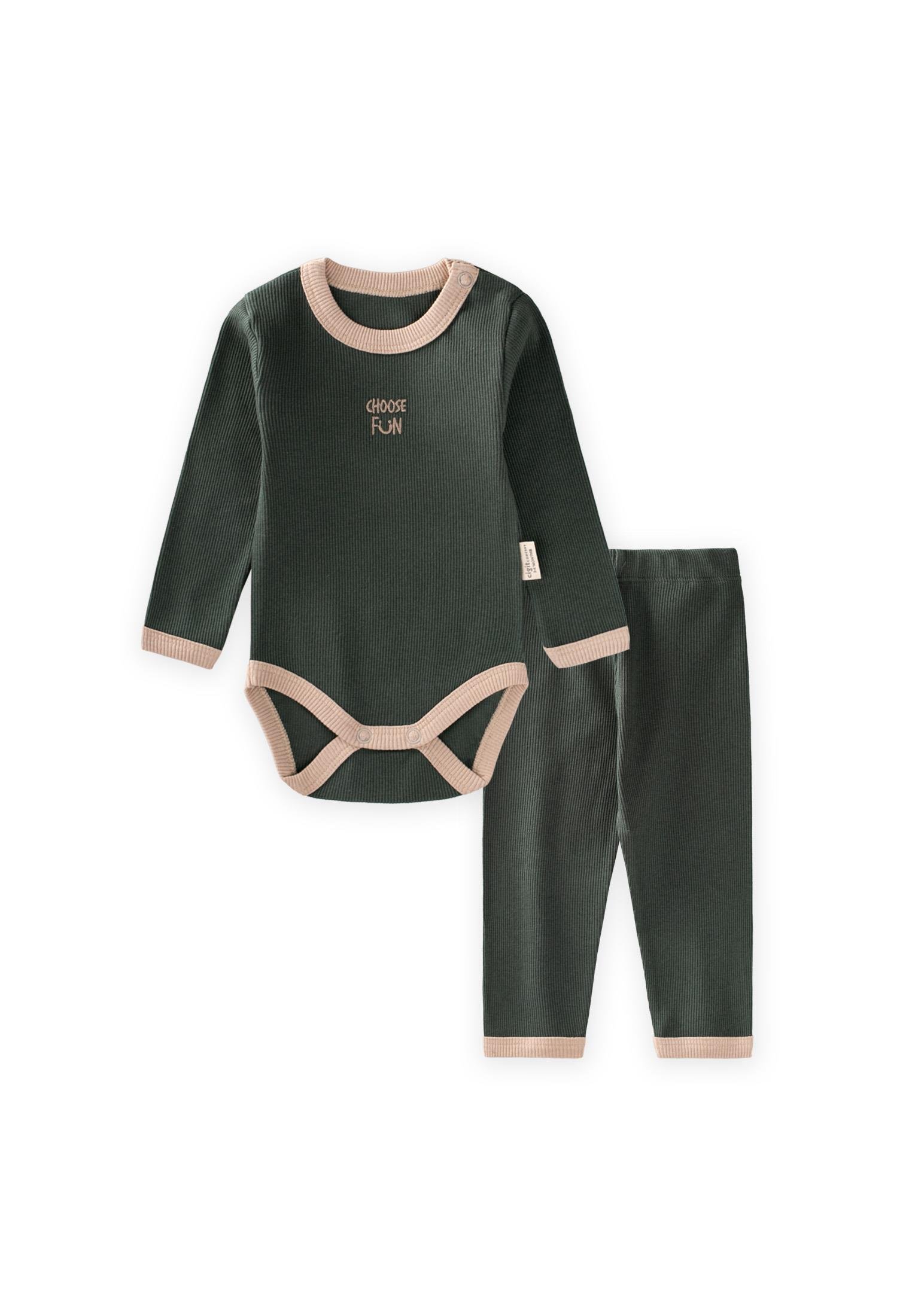 Embroidered Long-Sleeved Bodysuit Set 0-3 Years Khaki Green