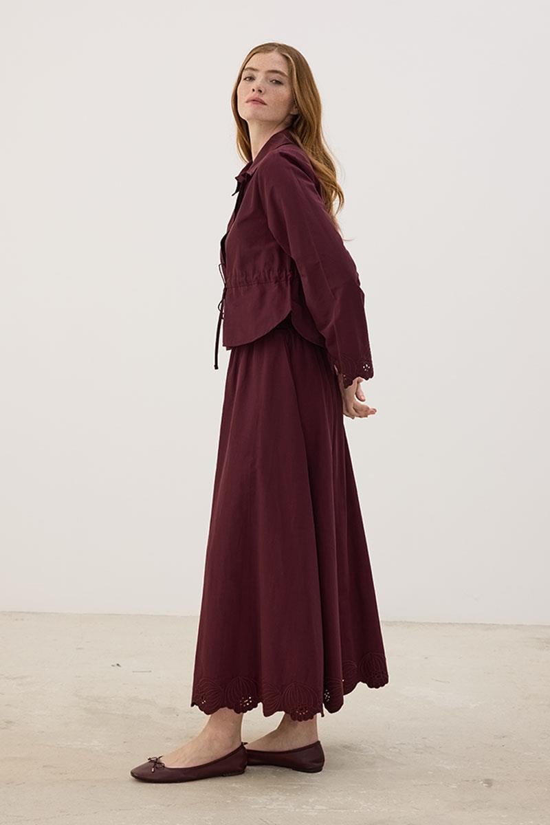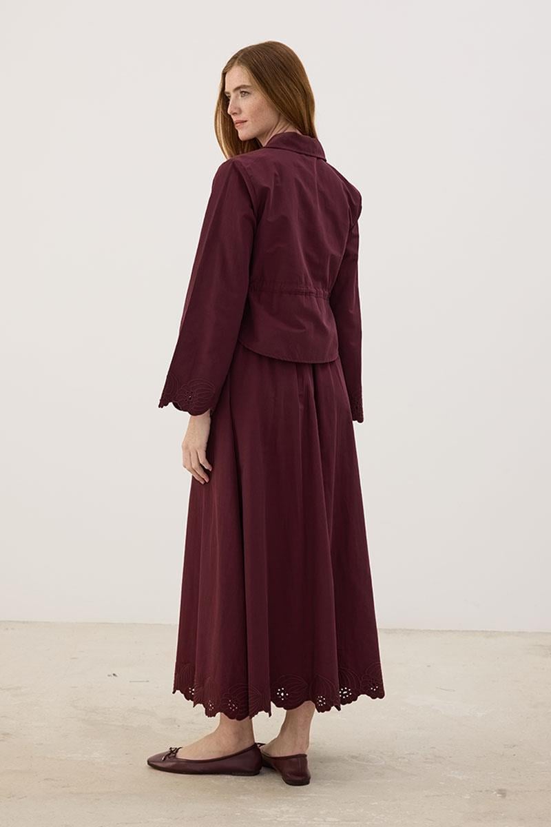 Tags: burgundy, cotton blend, embroidered skirt, lined, pockets, seasonal wear, women's fashion