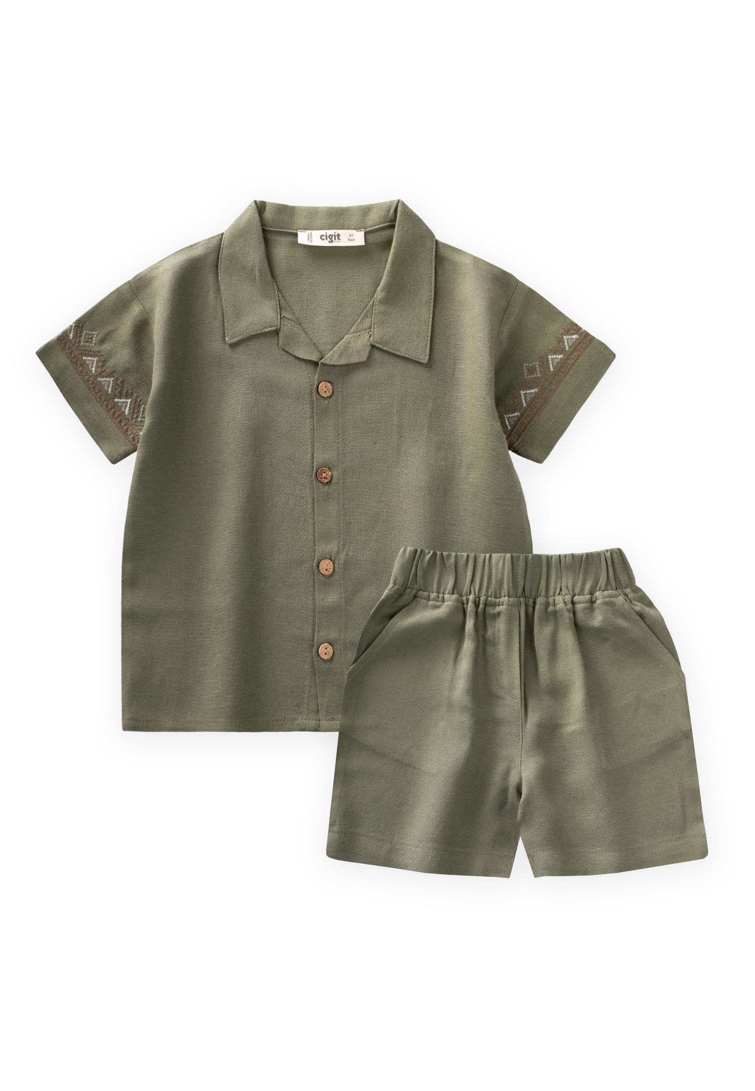 Embroidered Sleeve Shirt and Shorts Linen Set 2-7 Years Old Khaki Green