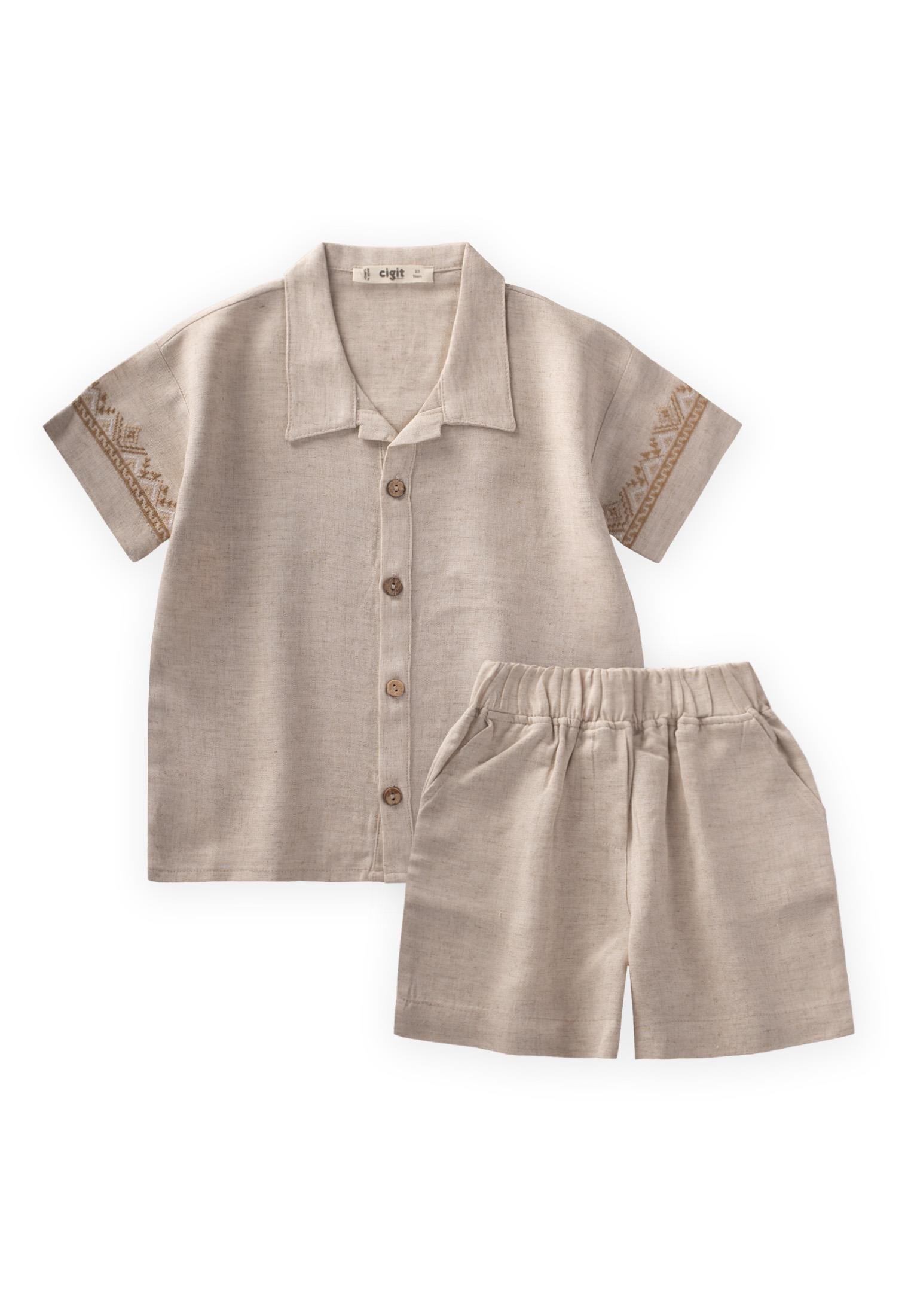 Embroidered Sleeve Shirt and Shorts Linen Set for Ages 2-7 in Natural