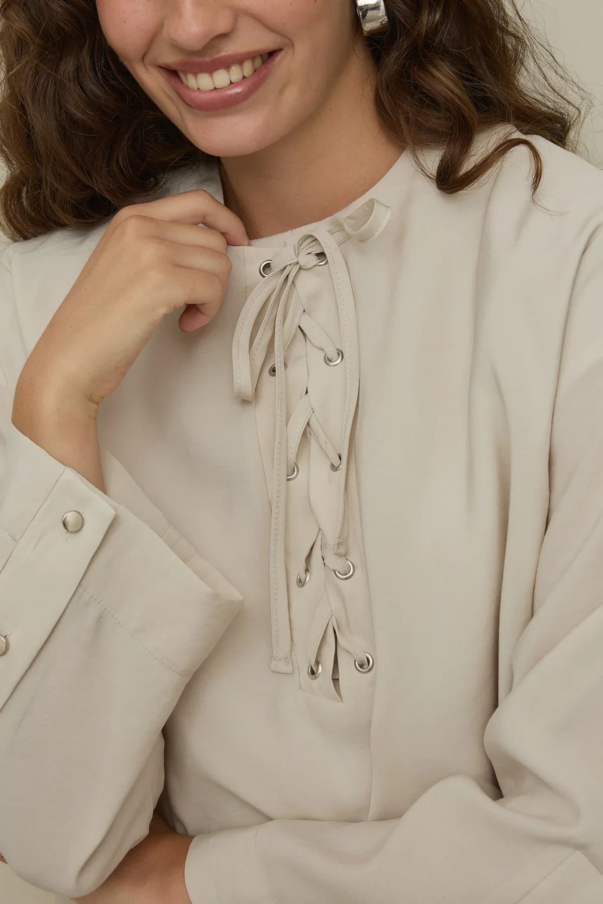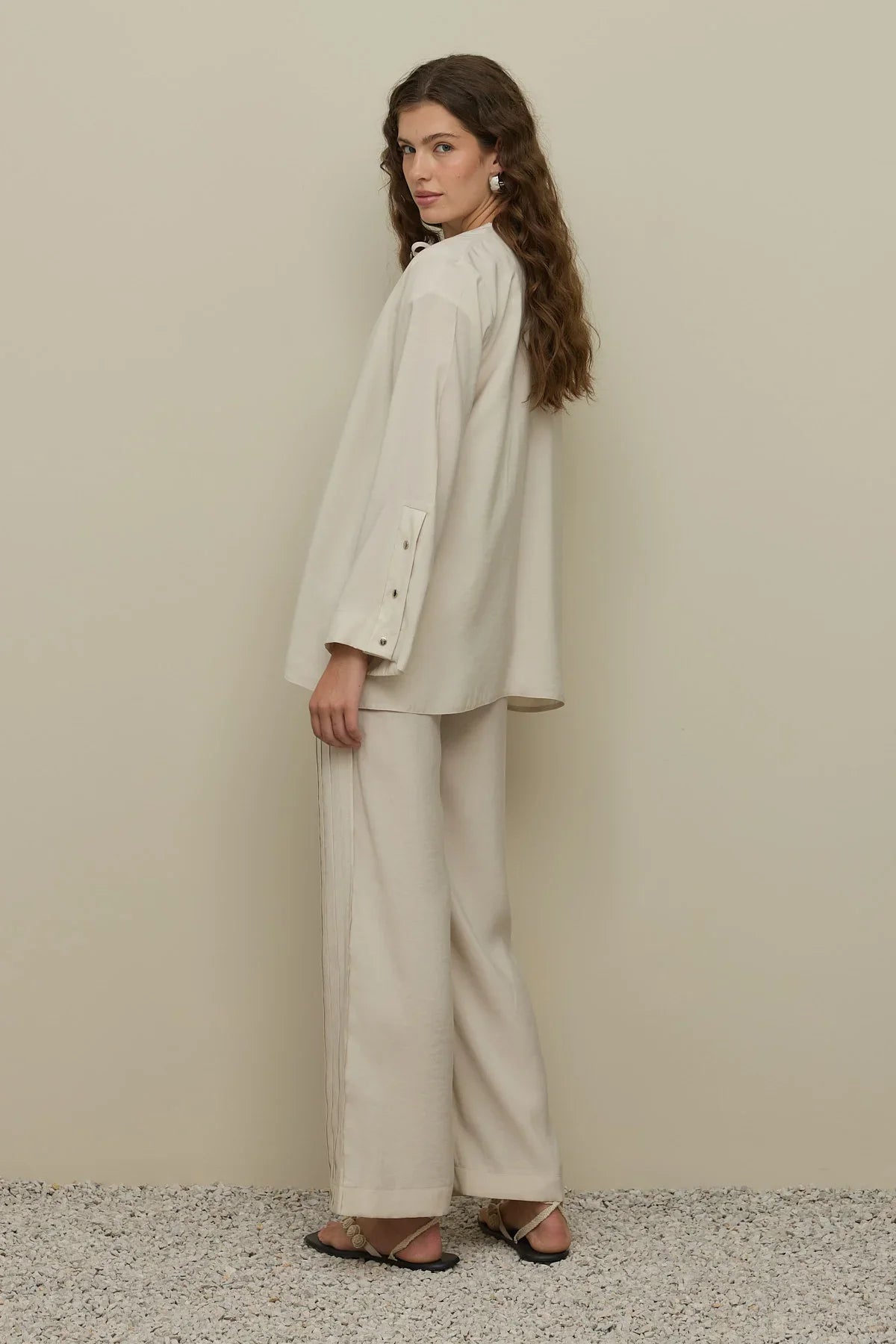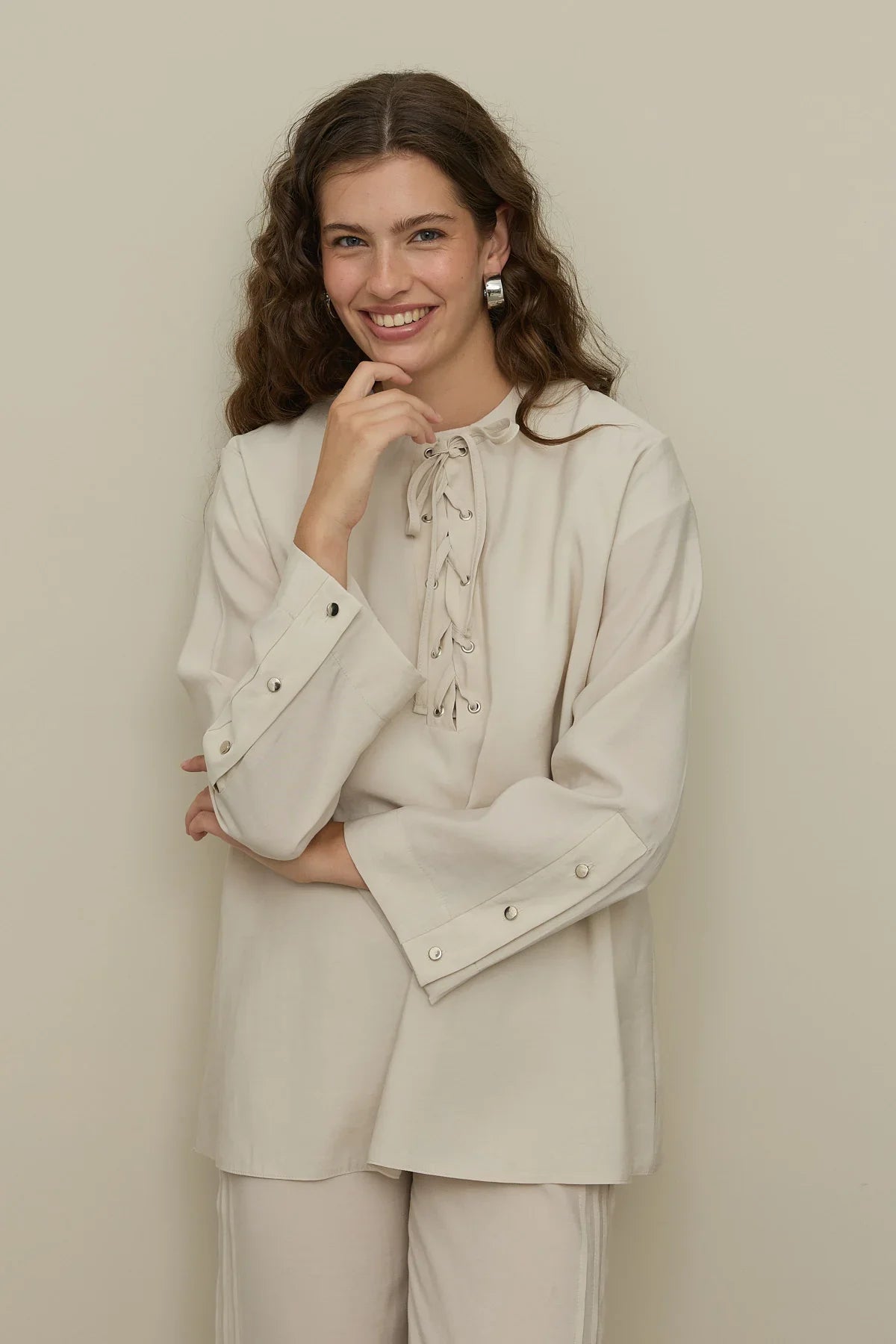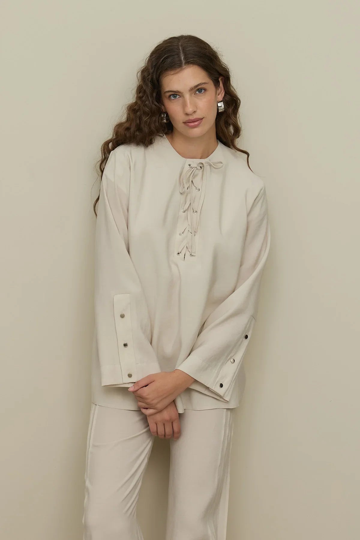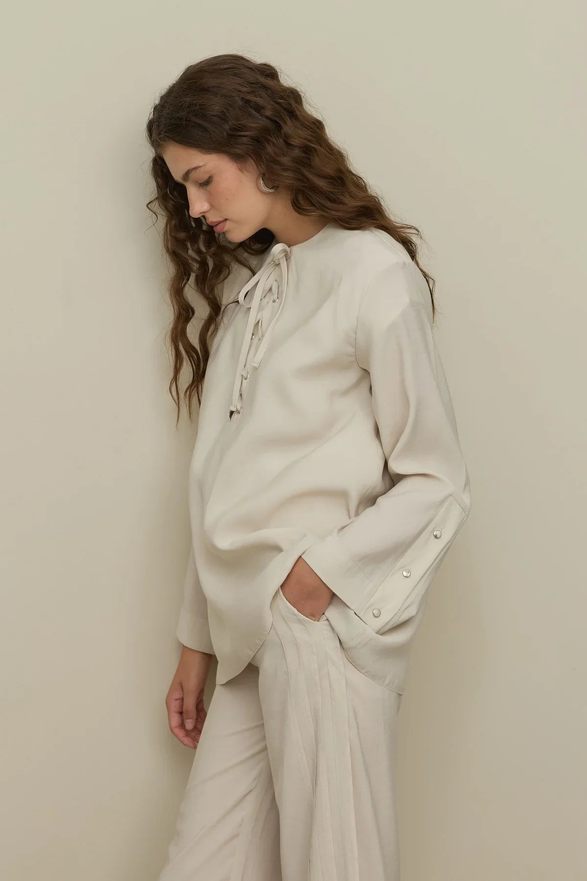 Made from modal fabric with a drape texture, this pant suit features a bike collar, a front placket, eyelet tape closure, long sleeves with wide cuffed buttons, and pants with elastic waist, pockets, and multiple pleats on the side.
