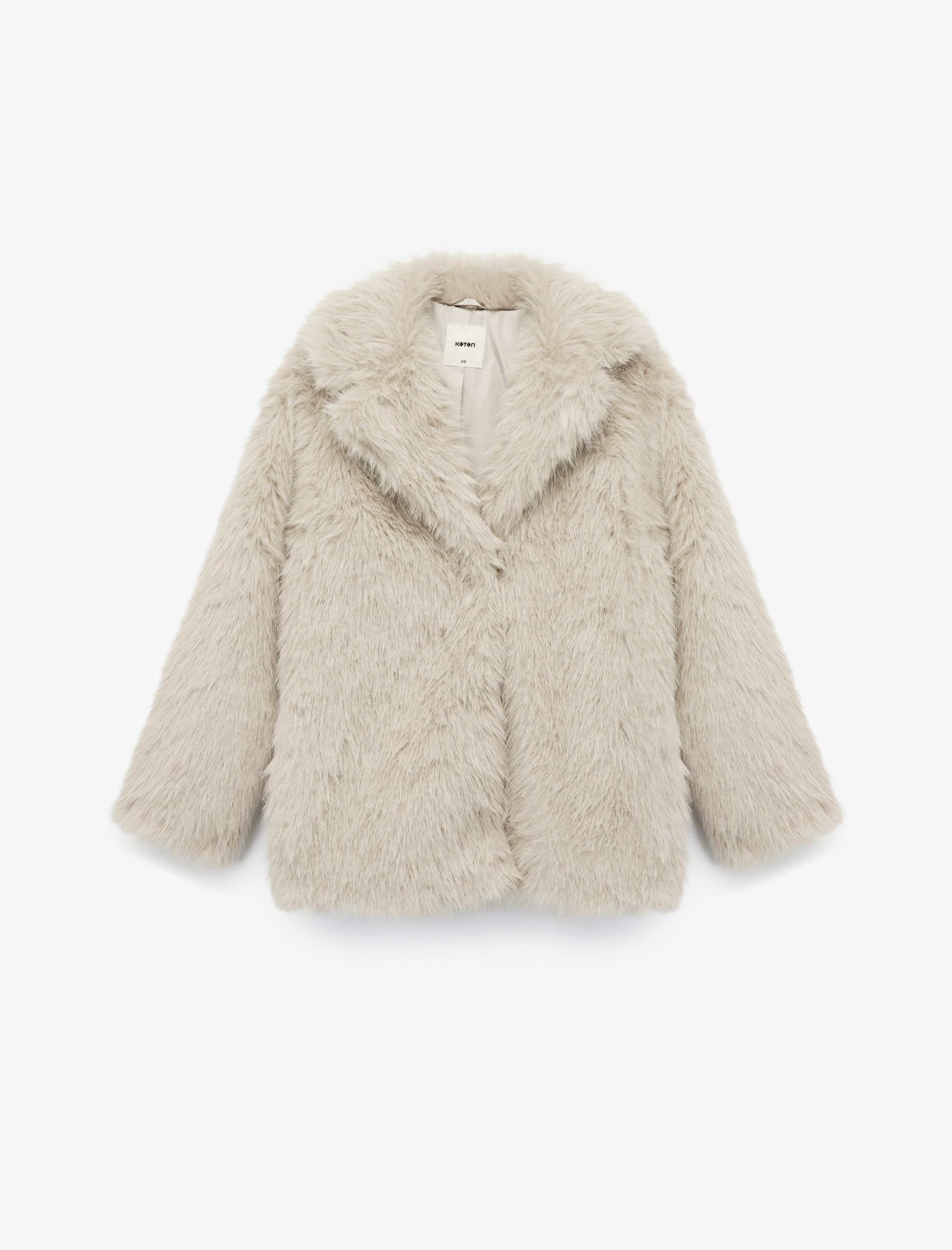 This faux fur coat features a long-sleeve design with a distinctive cross collar, offering both warmth and sophisticated style. Its soft texture ensures comfortable wear, while the classic silhouette adds elegant charm. With a modern yet timeless design, this faux fur coat is a favorite choice for both everyday wear and special occasions. Styling Tip: For a trendy look, pair this faux fur coat with long slip dresses. Complete the ensemble with heeled boots and an elegant clutch for a sophisticated style perfect for evening events. Alternatively, combine it with a thin turtleneck sweater for extra warmth on cold days. Enhance your style further with gold accessories. Product Features: Sleeve Type: Long Sleeves, Collar Type: Cross Collar, Detail: Buttoned, Fit: Regular, Usage: Daily Wear, Special Occasions. Embrace cold weather with style using Koton’s chic and classic coat design. Discover trend-setting designs that combine elegance and comfort! — Technical Details — Fabric: 100% POLYESTER, Sleeve Length: Long Sleeves, Sleeve Type: Dropped Shoulder, Collar Type: Cross Collar, Lining: 100% POLYESTER, Silhouette: Classic, Product Type/Style: Classic, Sub-Brand: City fashion, Seller/Manufacturer/Importer Name: Koton Mağazacılık Tekstil Sanayi ve Ticaret A.Ş., Postal Address: Ayazağa Mah. Maslak Ayazağa Cad. No:3 İç Kapı No:5 Sarıyer/İstanbul, Email Address: mim@koton.com