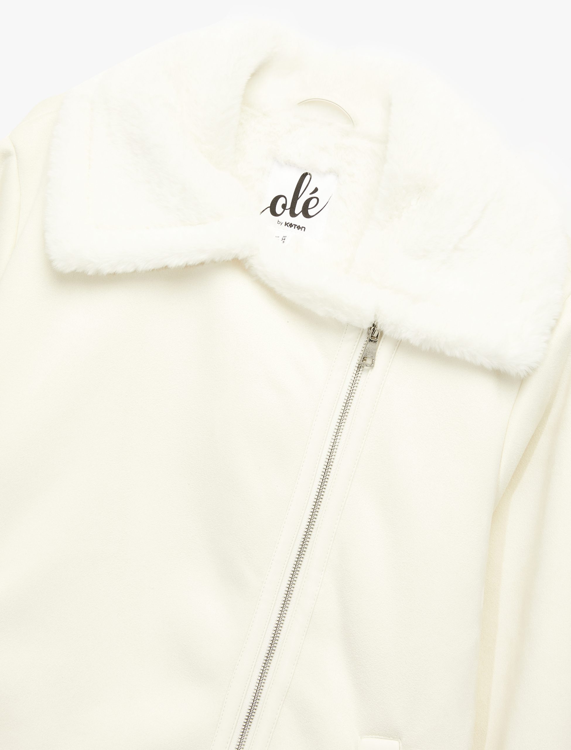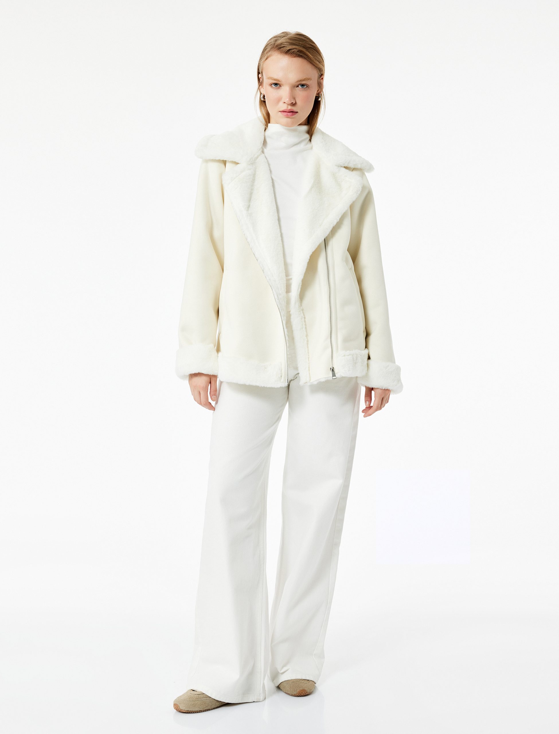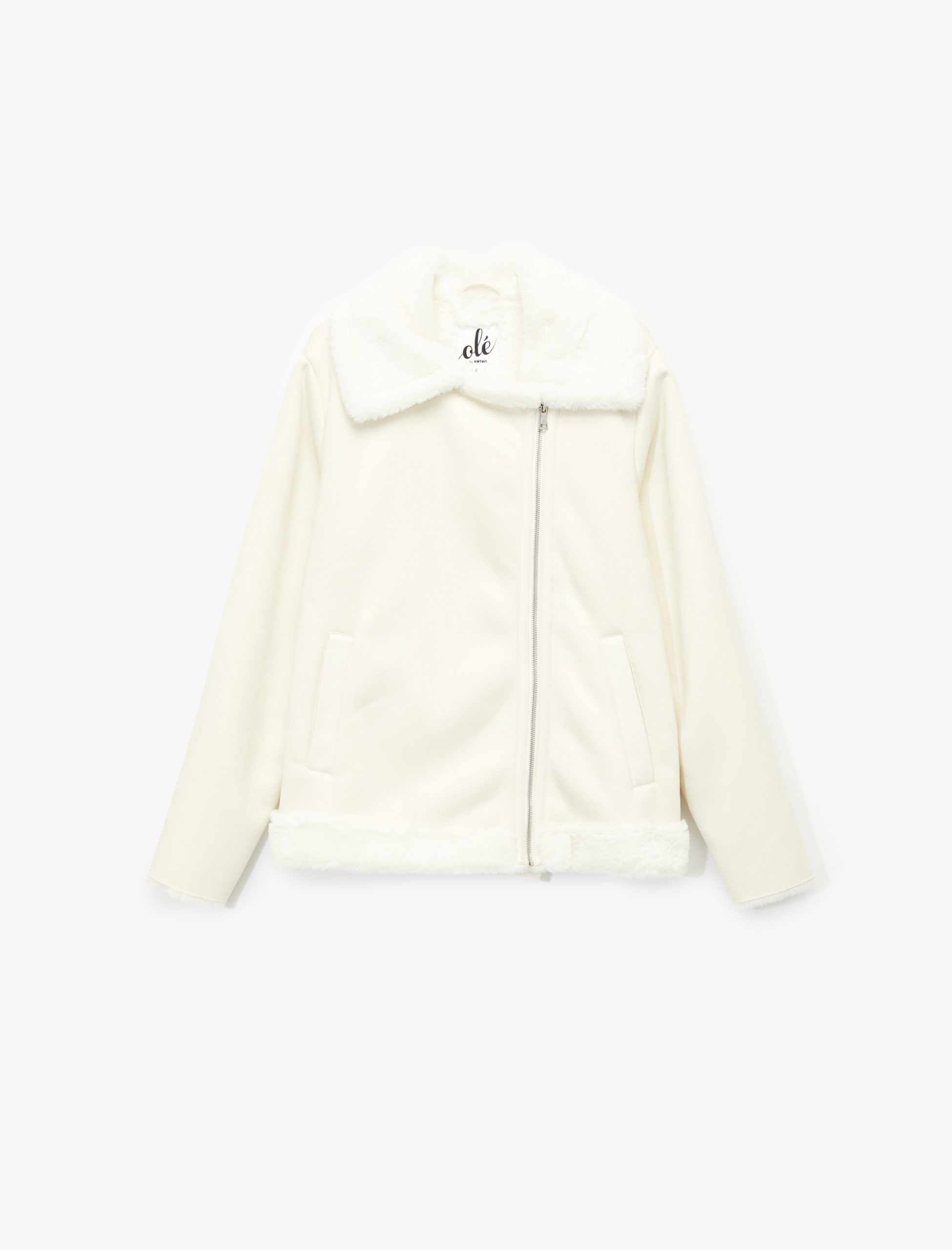 This jacket catches the eye with its faux fur collar detail and zippered construction. The long sleeve design makes it an ideal choice for cold weather, while the regular fit cut ensures comfortable wear. The use of two different fabrics gives the jacket a modern and chic feel. Its length makes it suitable for both daily outfits and special occasions. The zippered pockets offer practical use, while the faux fur details add a sophisticated touch to your style.