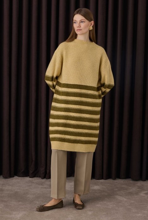Featuring modern lines, the fine-striped long sweater combines comfort and style with its fisherman neck detail. Its elongated form ensures a comfortable and elegant look.