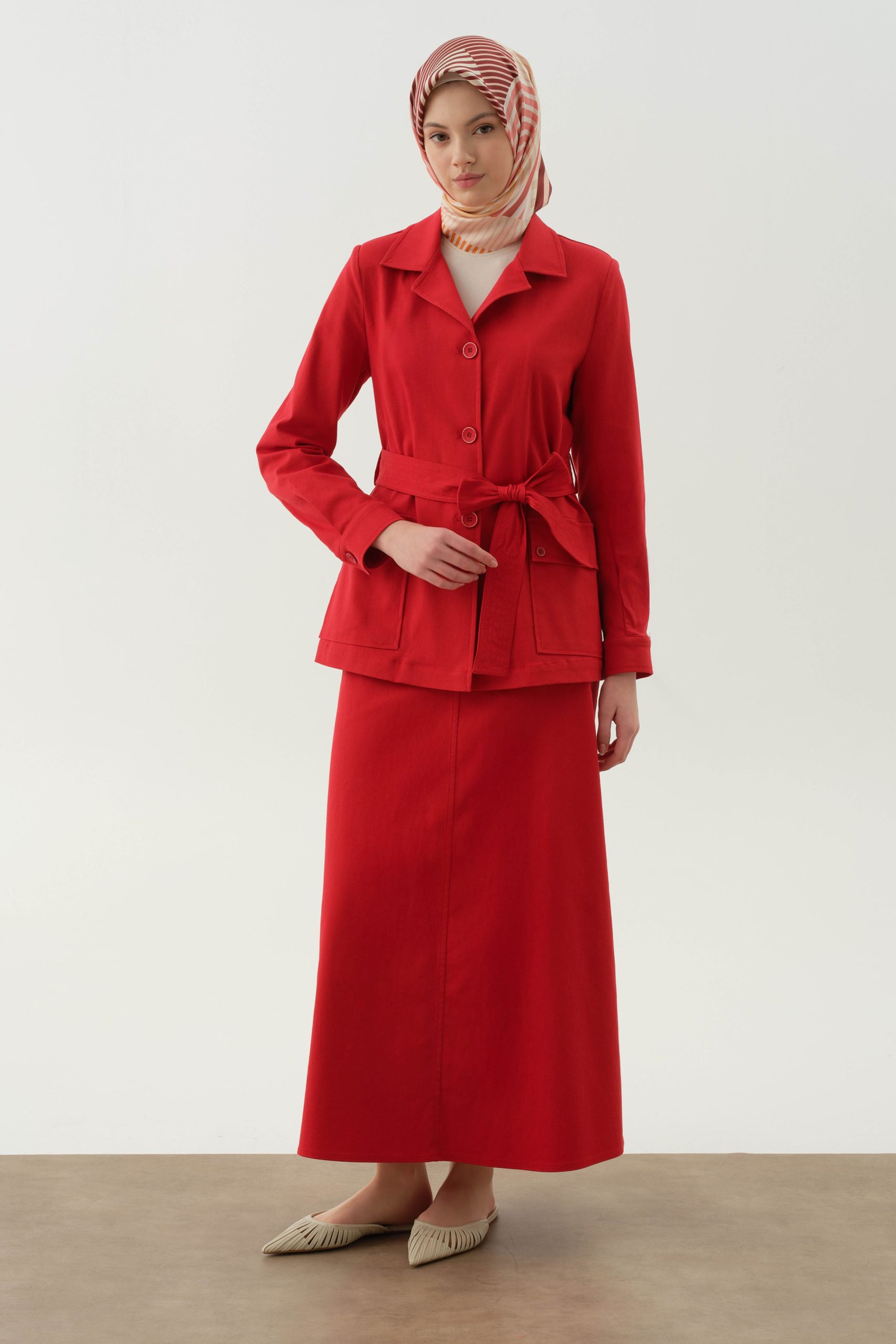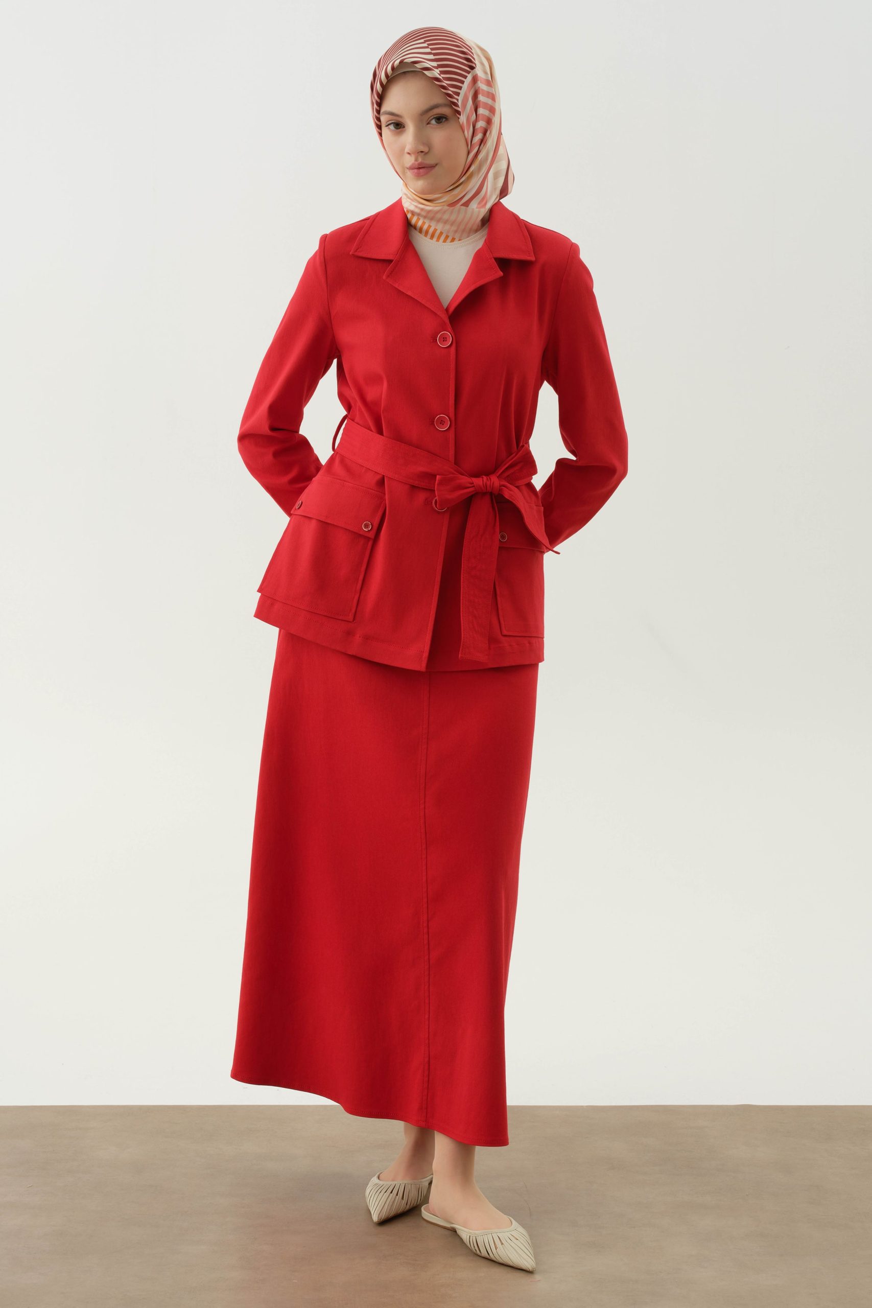 Offering both elegance and practicality with its five different pocket details, this skirt has a modern and functional design. While providing a simple look with its straight cut, it adds a dynamic air with its pocket details. It easily accompanies your daily combinations.