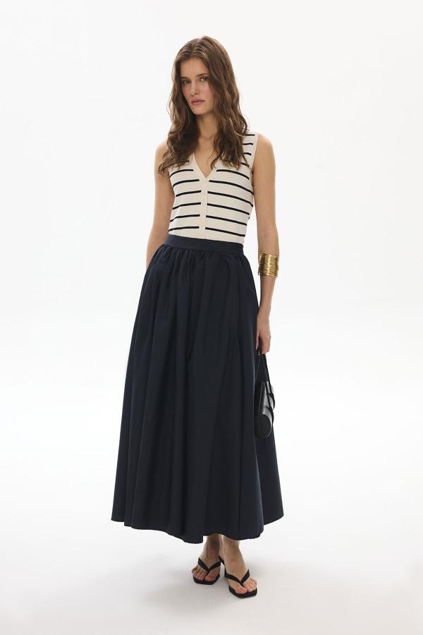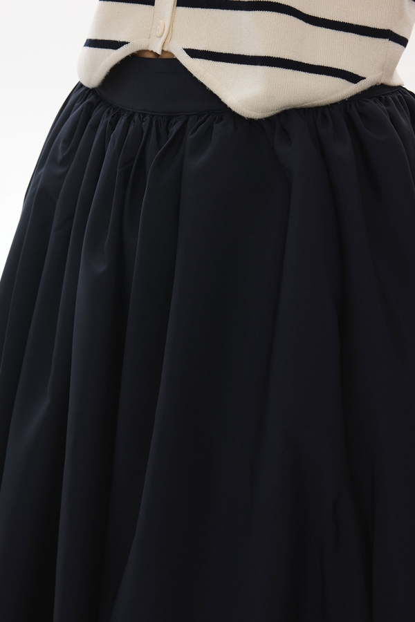 Orta bel, büzgülü, arkadan gizli fermuarlı, yanlardan cepli, premium telalanmış hacimli duran kumaştan iç belli etmeyen astarsız balon etek.