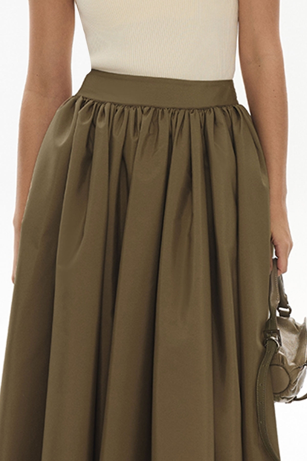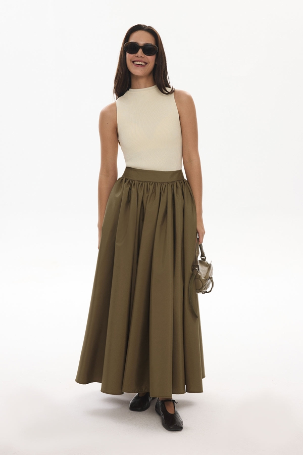 Orta bel, büzgülü, arkadan gizli fermuarlı, yanlardan cepli, premium telalanmış hacimli duran kumaştan iç belli etmeyen astarsız balon etek.