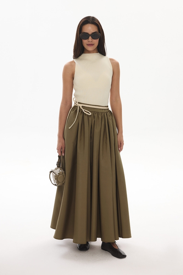 Yüksek Bel Bağcıklı Geniş Form Kloş Etek Ekru