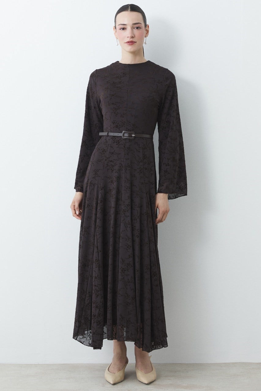 With its feminine cut, it fits the body gracefully and creates a flowing silhouette as you move. The lined construction provides secure use without transparency and offers a wide range of uses from special occasions to daily combinations. The flock print detail creates different textures depending on the light, giving the dress a modern character.