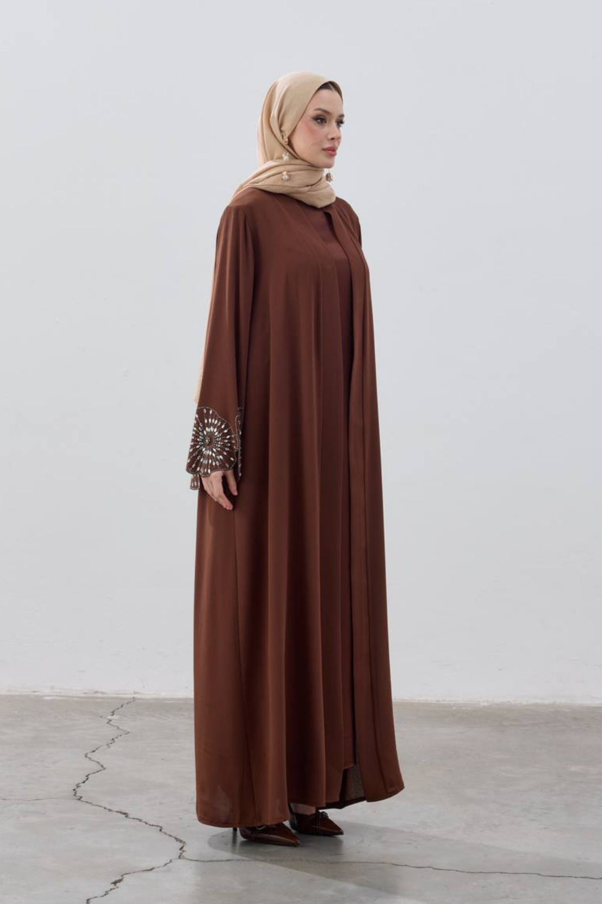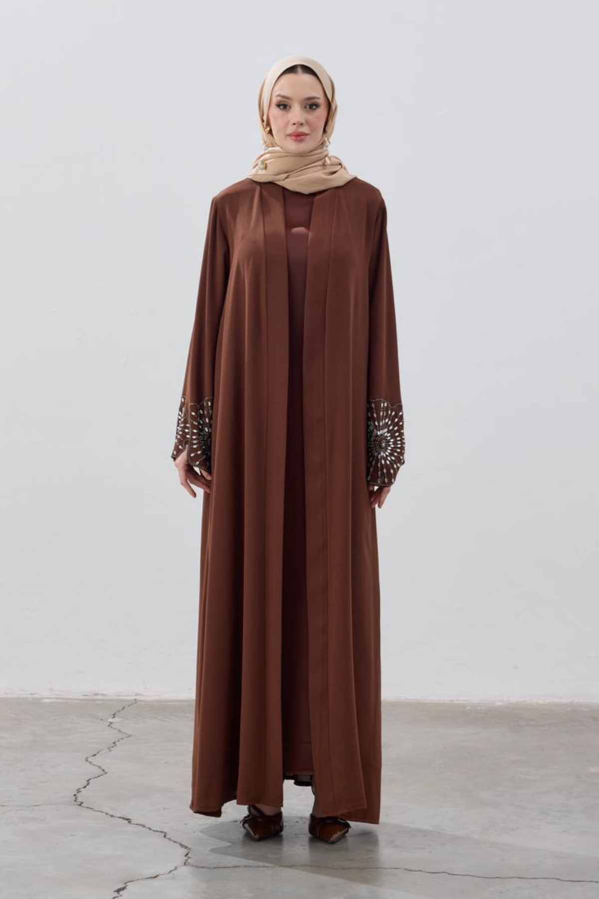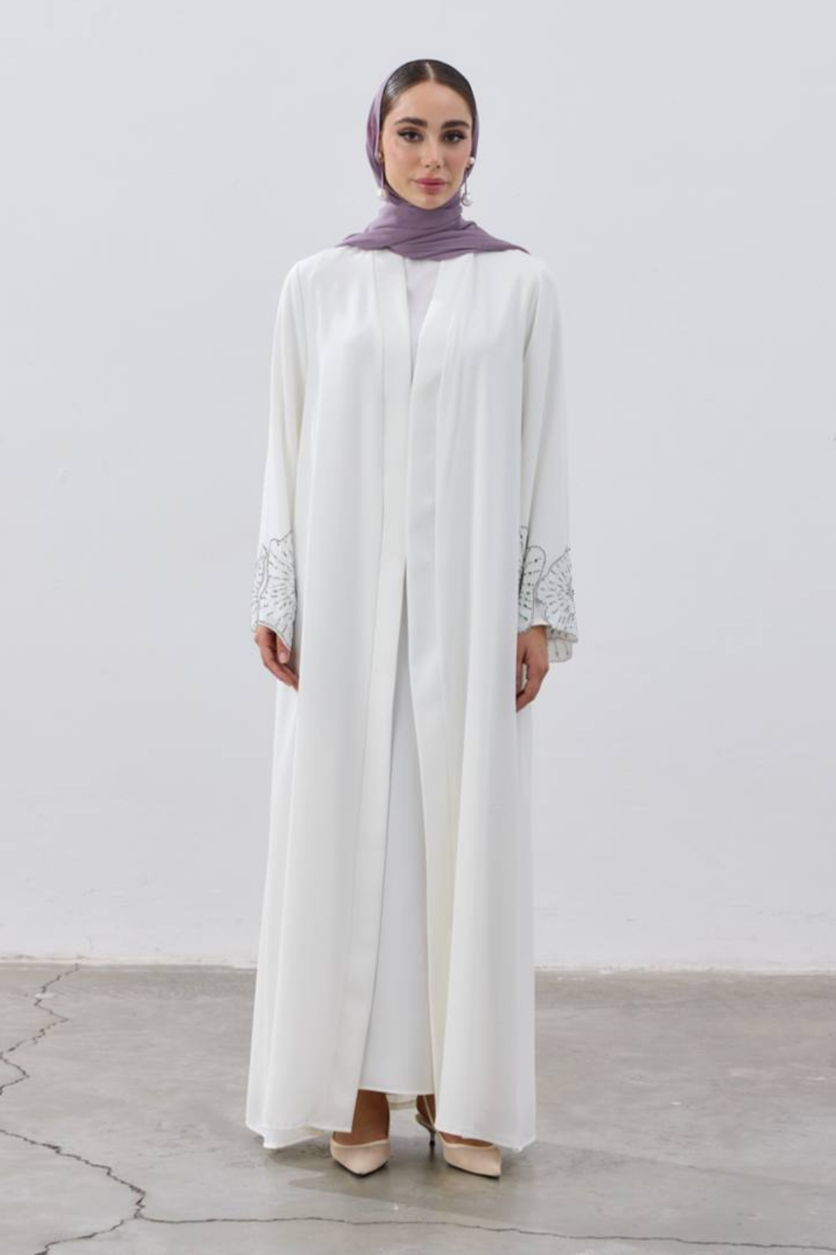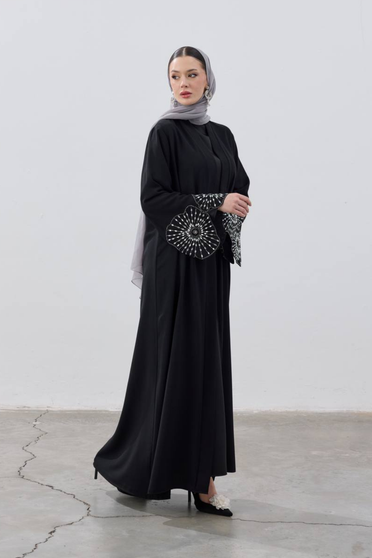 🌼 Floral-patterned crystal embroidery with a flowing silhouette🌟 Soft and graceful drape in lightweight crepe fabric🖤 Classic open abaya design✨ Perfect choice for daily elegance and special occasions