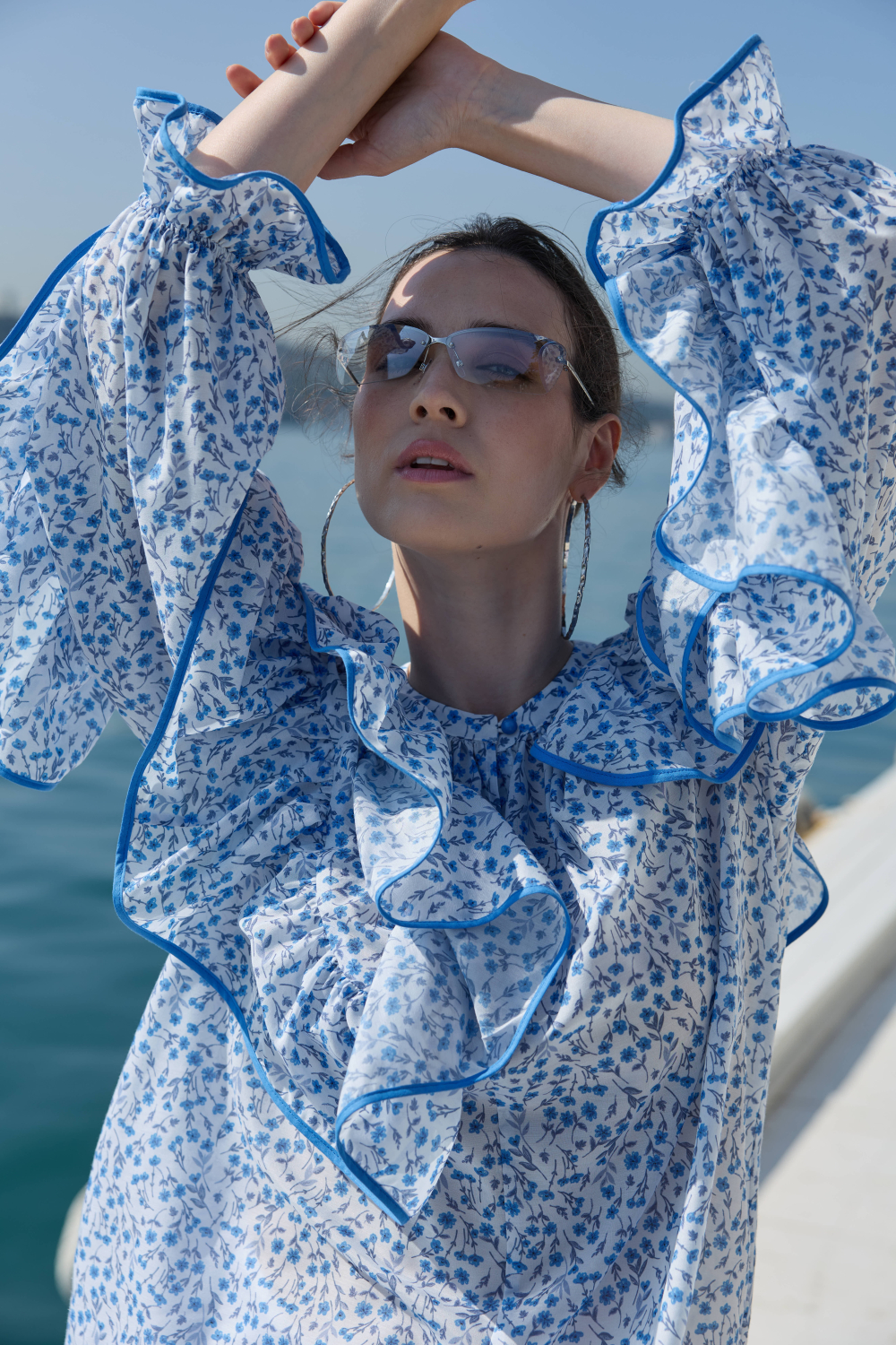 Exclusive design floral patterned cotton blouse. Fabric content: 100% cotton. Features an adjustable belt with a movable sash. Size 1: Fits 36-38-40. Size 2: Fits 40-42-44. Product measurements for Size 1: Chest 110 cm, Waist 118 cm, Length 76 cm. Model is wearing Size 1. Model’s measurements: Height 180 cm, Chest 86 cm, Hips 94 cm.