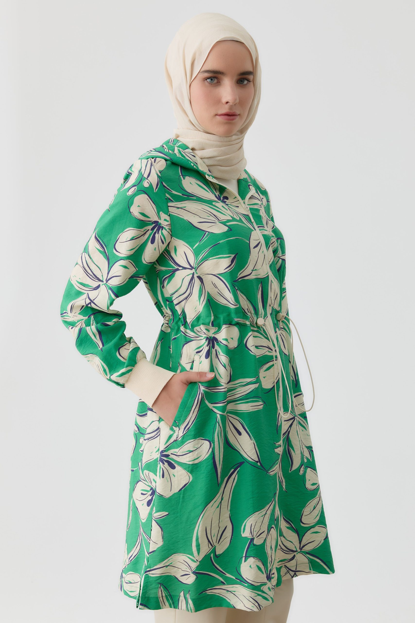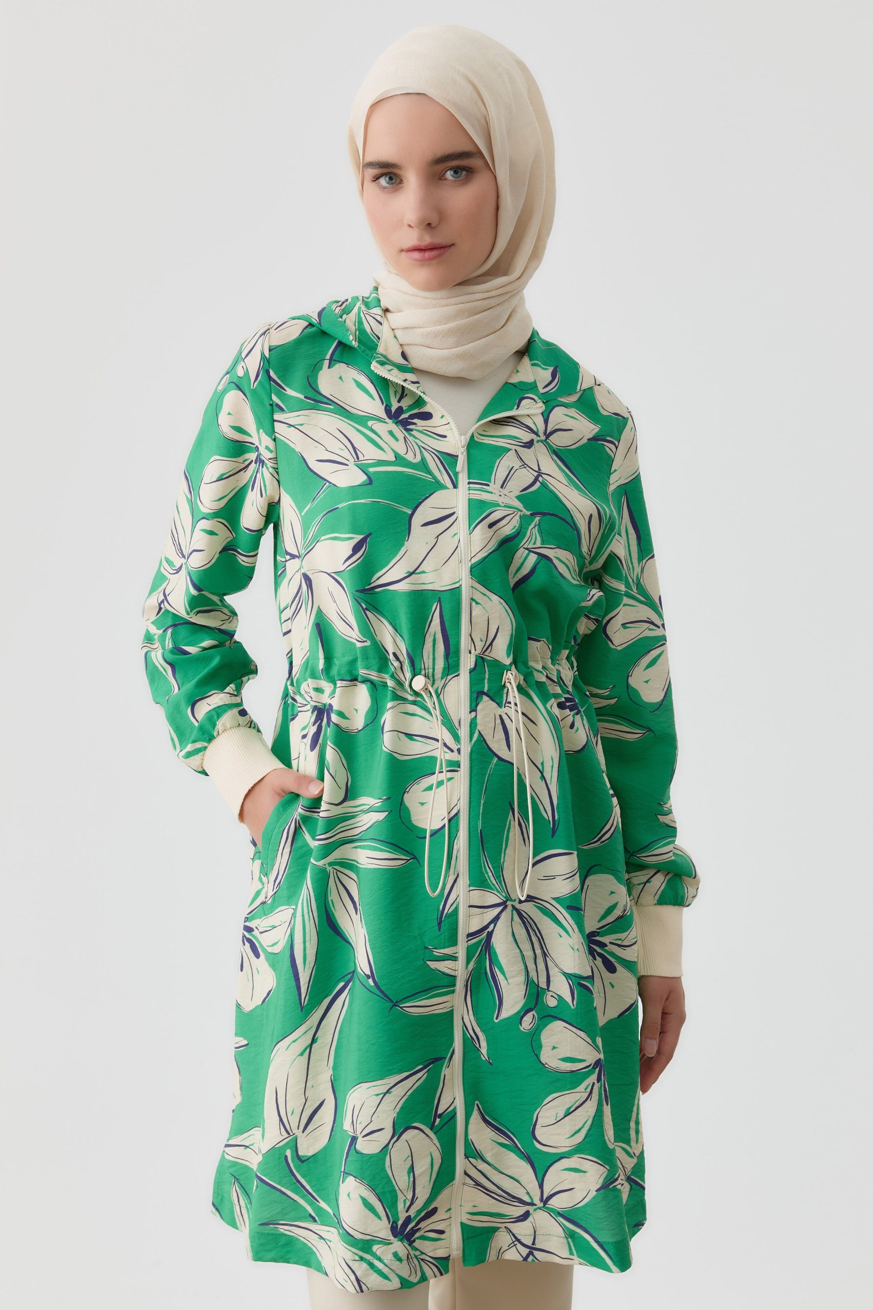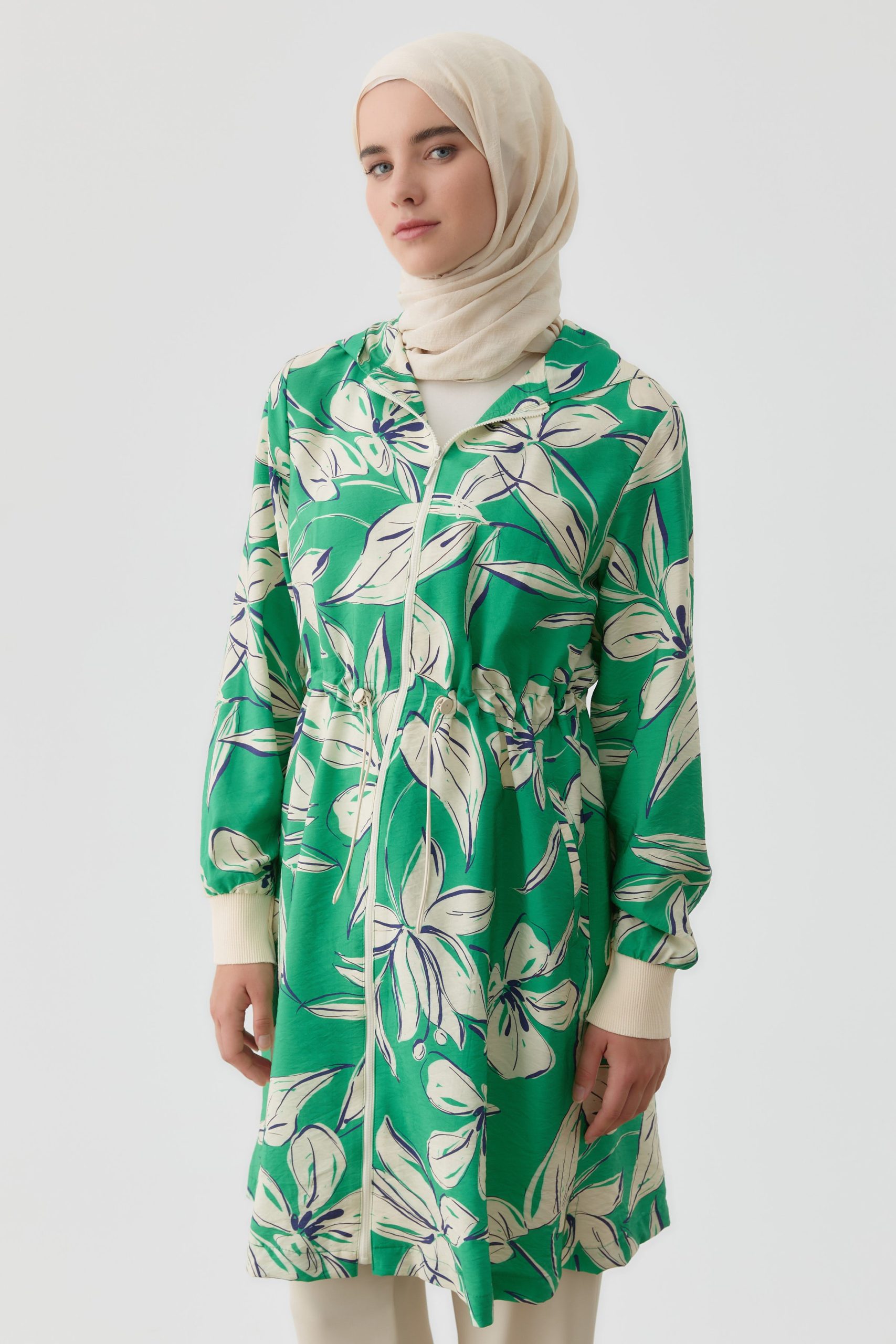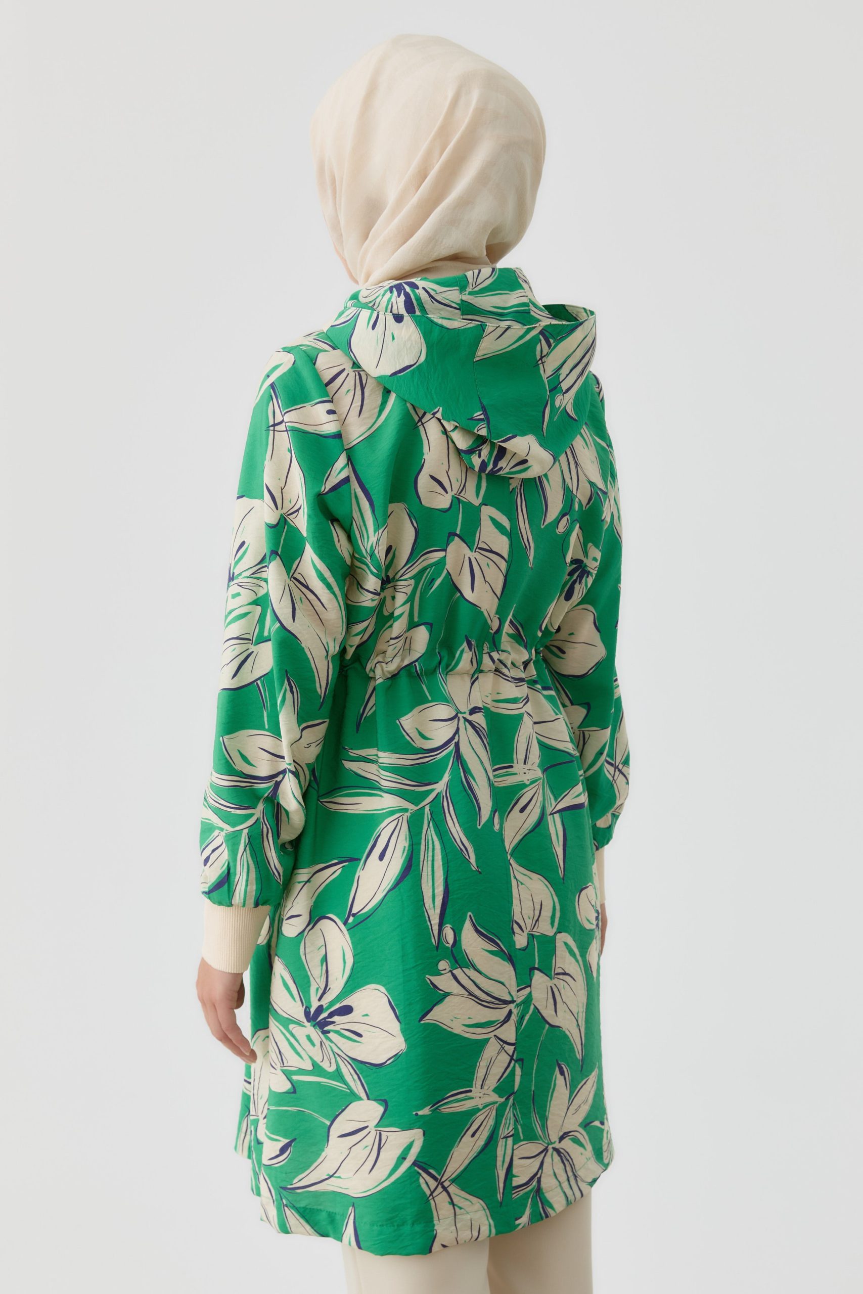 This cape gains a feminine flair with its floral patterns, offering a sporty touch with its hood detail. Its comfortable fit adds both comfort and style to your daily outfits.