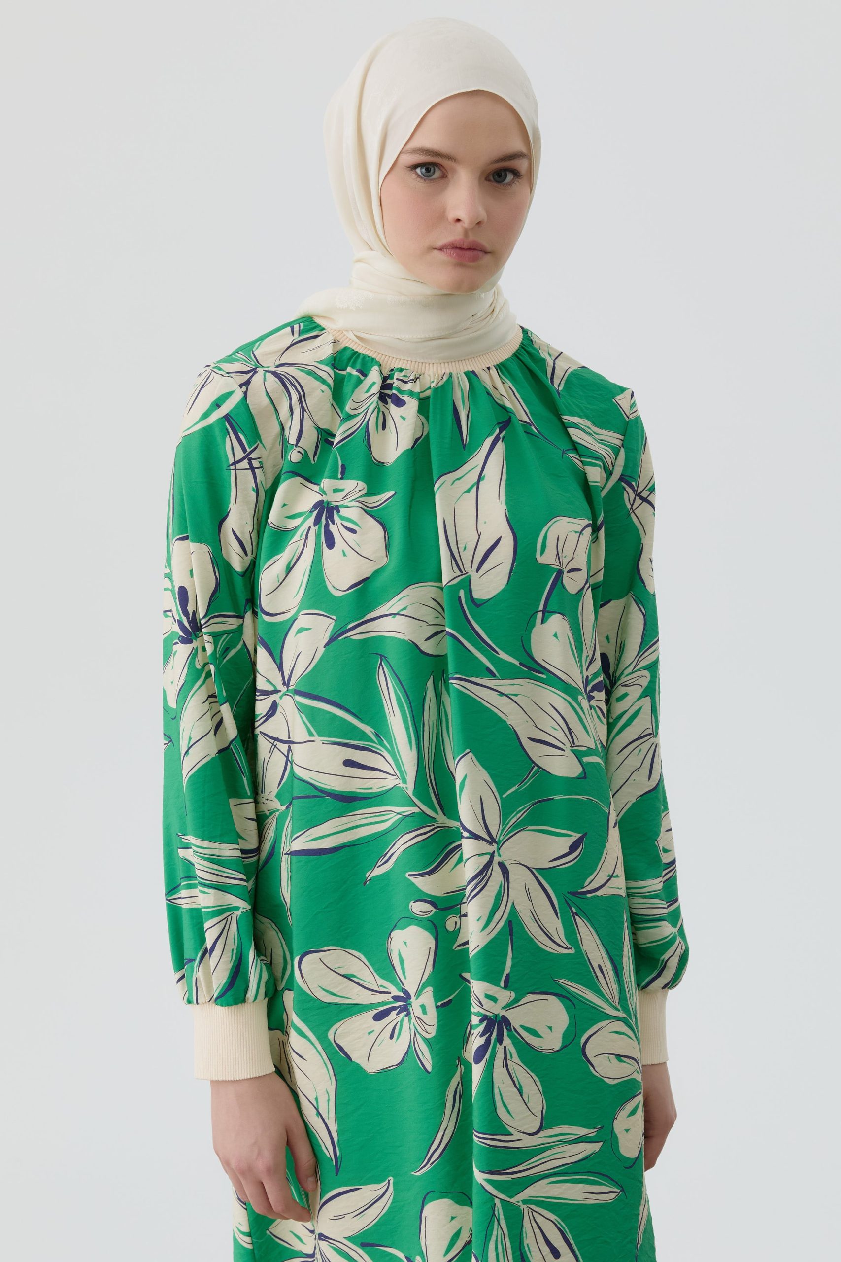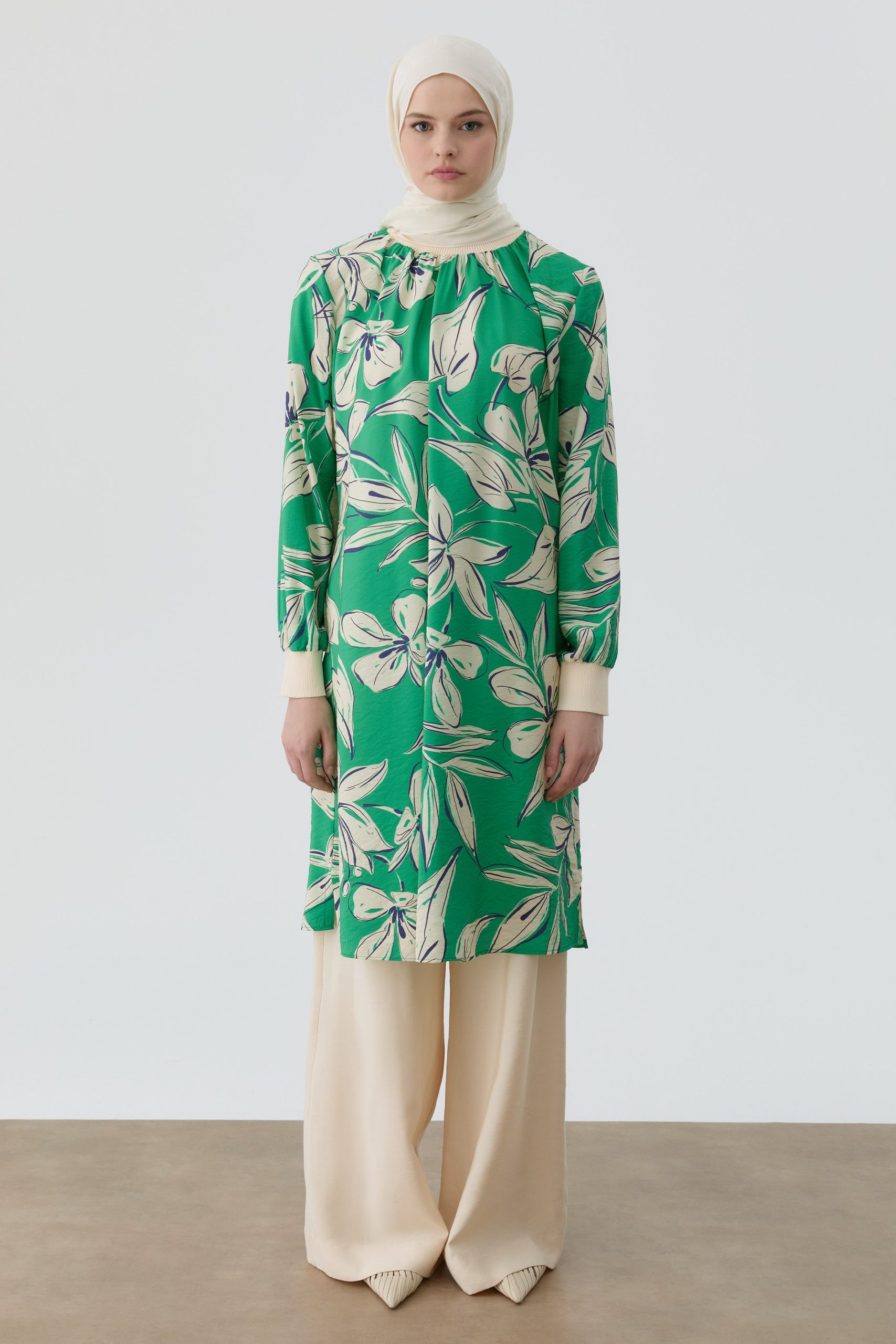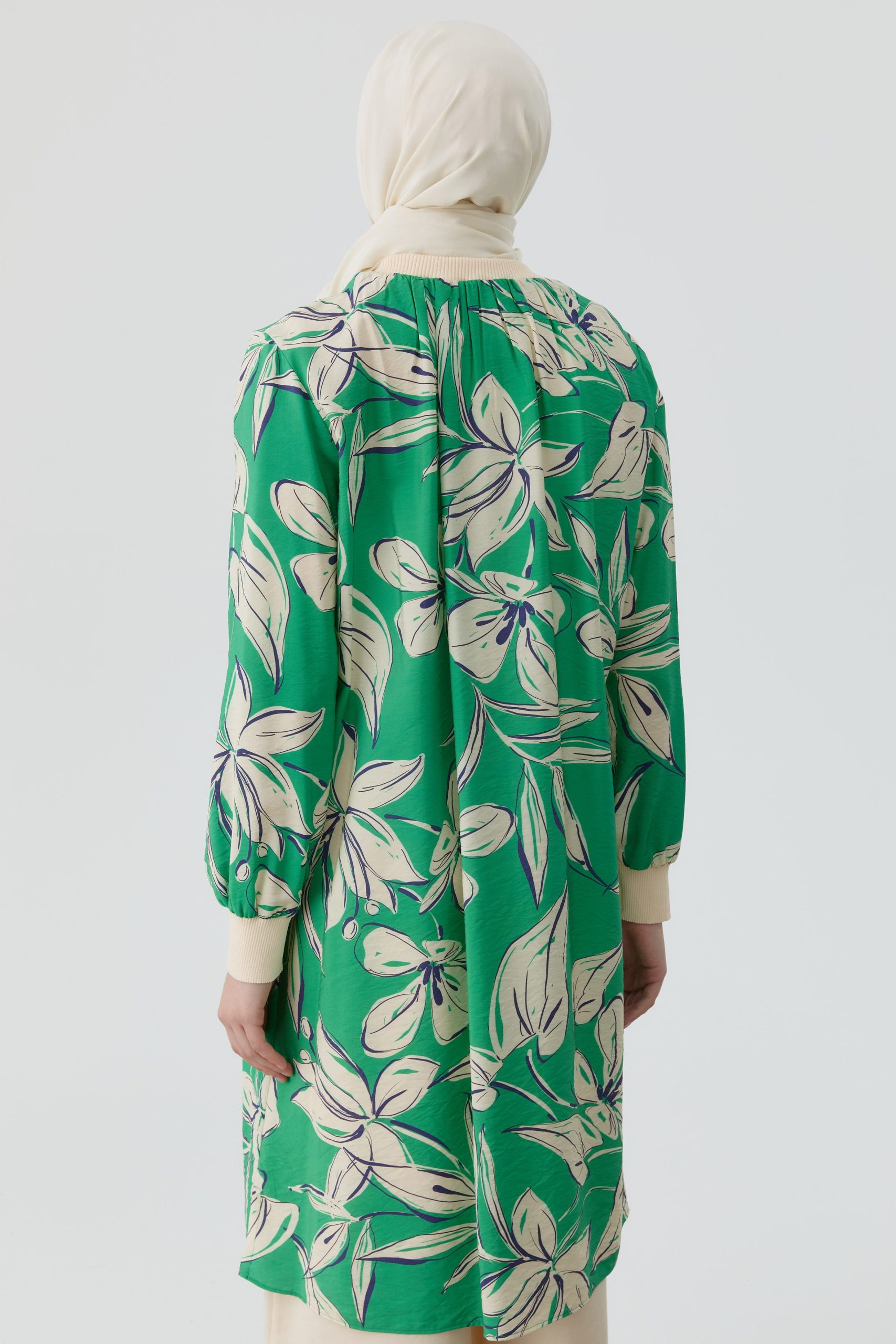 Floral Patterned Tunic with Ribbed Details – Green