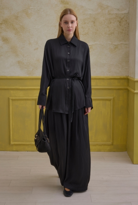 This satin set, made from 100% polyester fabric, offers a rich and dynamic texture on its surface thanks to its special crinkled weaving technique. The natural sheen and fluid appearance of satin give the design an elegant glow, while the polyester content ensures durability, shape retention, and long-lasting wear. Its lightweight and flowy structure creates a graceful silhouette on the body.