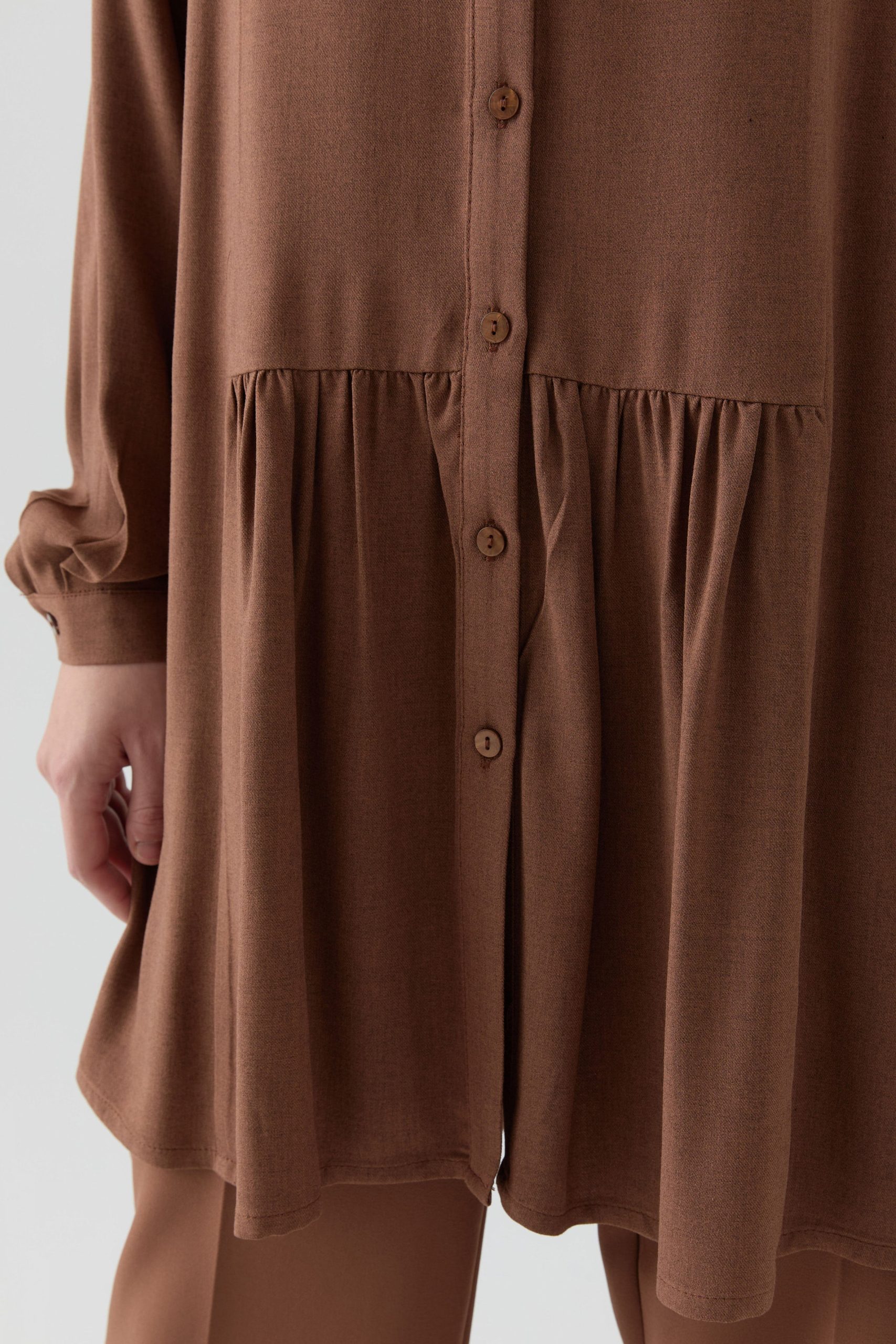 This tunic stands out with its gathered details at the waist, offering a modern and elegant silhouette. Its comfortable fit ensures all-day comfort, while the graceful design creates a wide range of uses from daily combinations to special invitations.
