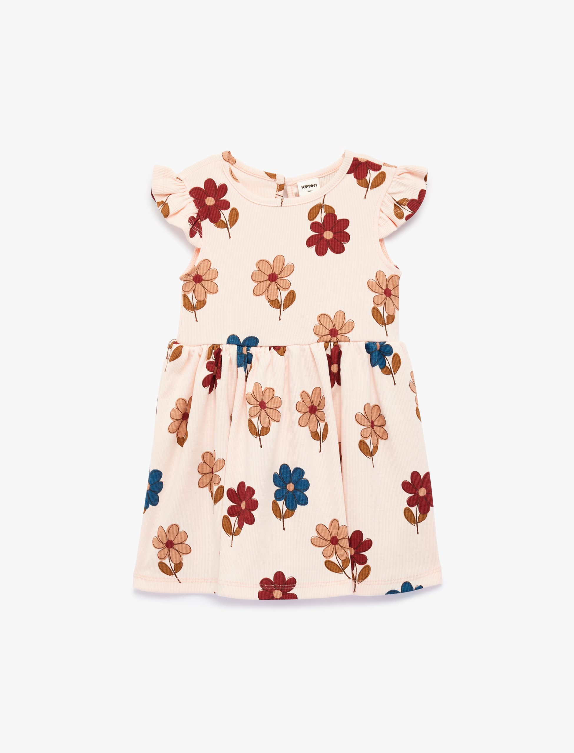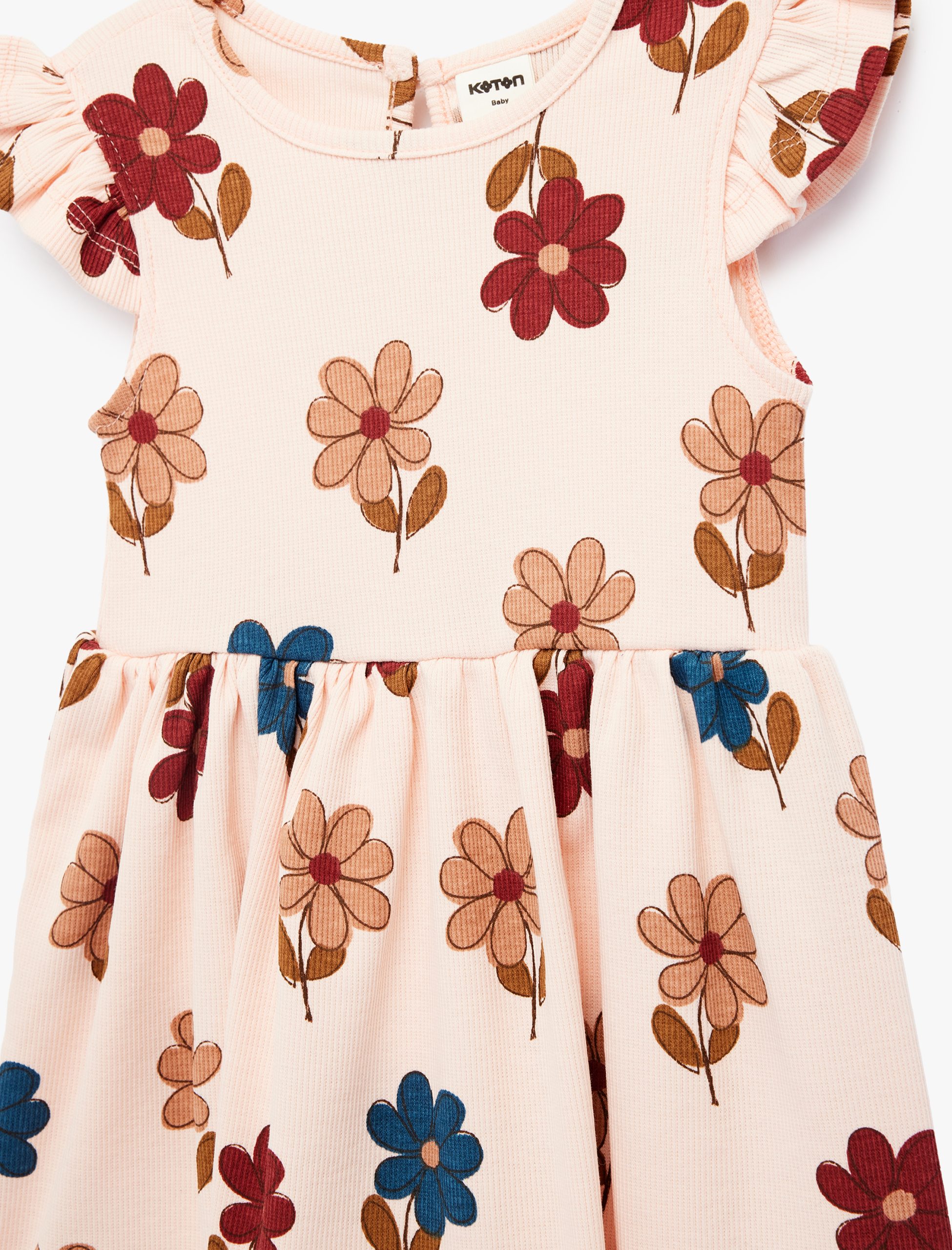 This sleeveless floral print dress is a favorite among little ones. Made from stretch cotton fabric, it provides all-day comfort while offering a cute style with its floral patterns. The dress features a bicycle collar design and ruffle details, making it an adorable choice. Its cotton texture and comfort allow for free movement during play.