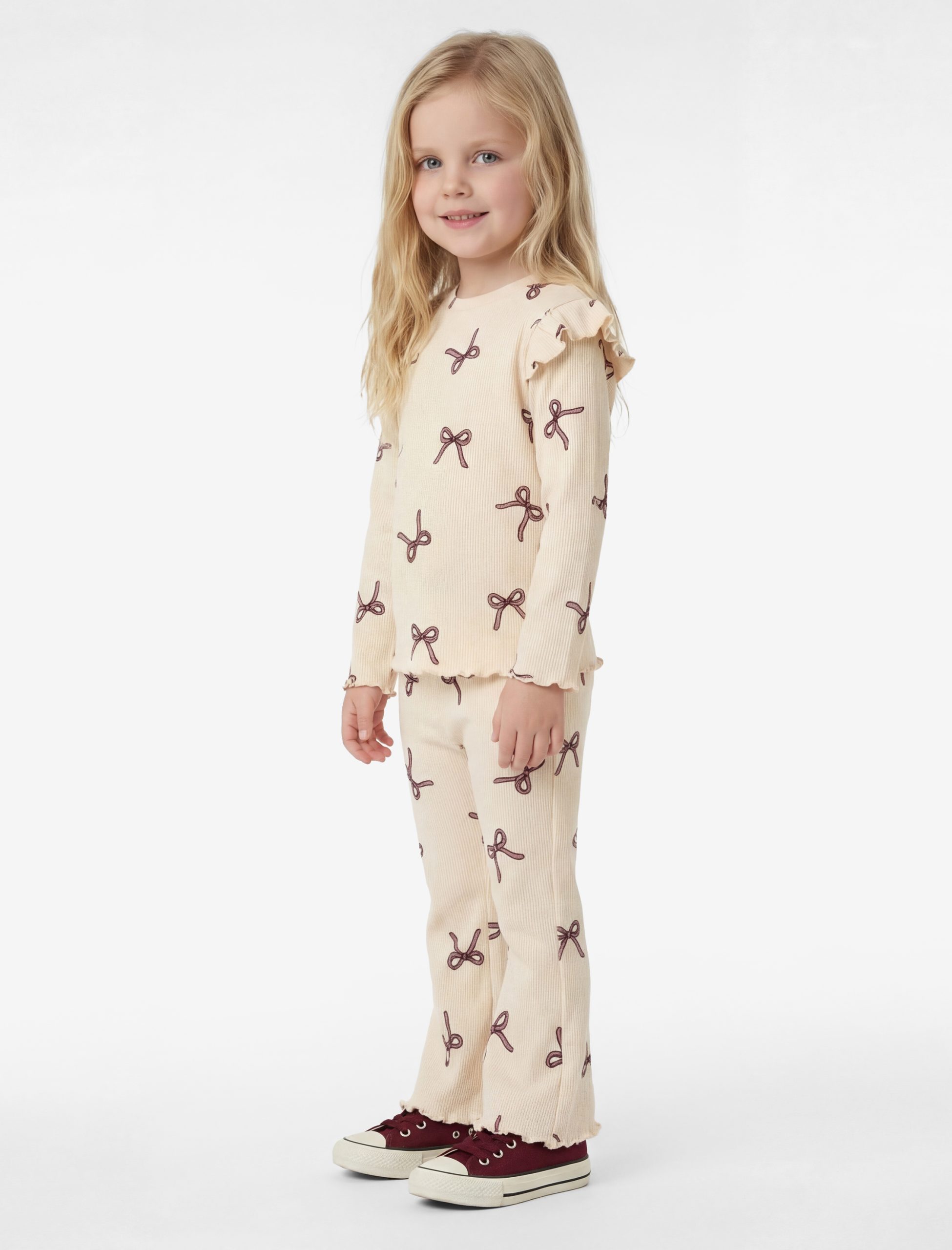 This adorable set catches the eye with its bow prints and ruffled details. It offers comfortable freedom of movement with its turtleneck long-sleeve t-shirt and Spanish-leg leggings. Thanks to its soft cotton structure, this set provides comfort for little ones and adds cheer with its bow patterns.