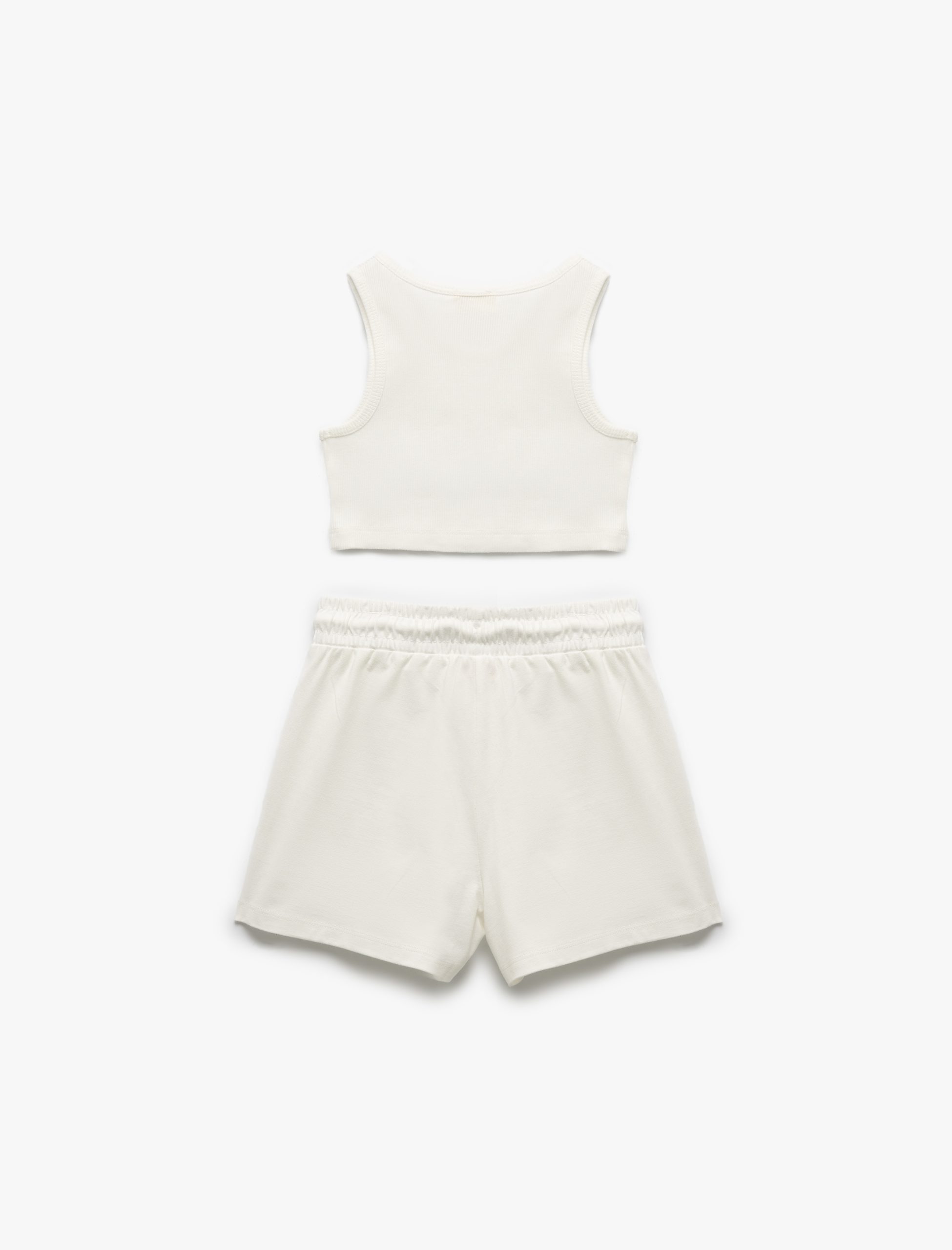 This sleeveless crop top and shorts set, made from breathable cotton fabric, keeps up with little ones’ energy during summer months. Thanks to its short length, it offers freedom of movement and can be comfortably worn for various activities or at the beach, ensuring all-day comfort.