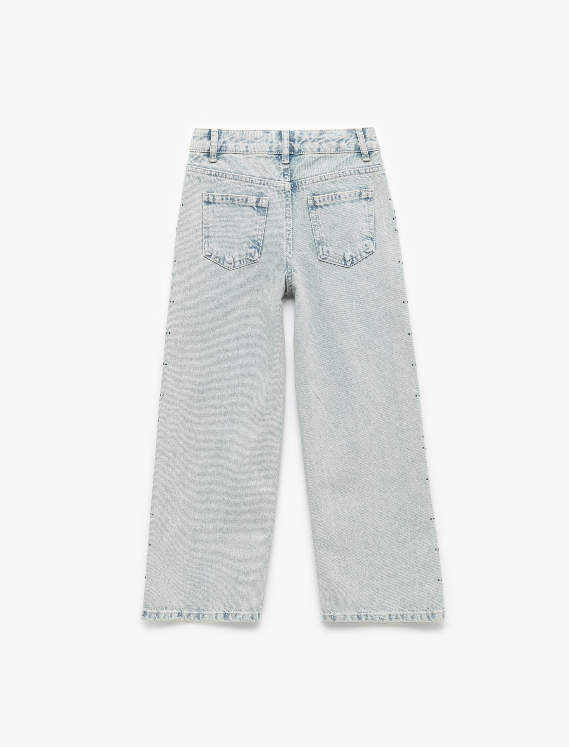 These wide-leg denim jeans offer a stylish and eye-catching look with stone embellishments. Made from cotton, they provide all-day comfort. The five-pocket design ensures practical use in daily life. With a regular fit cut and long leg length, they offer comfort without restricting your child’s freedom of movement.