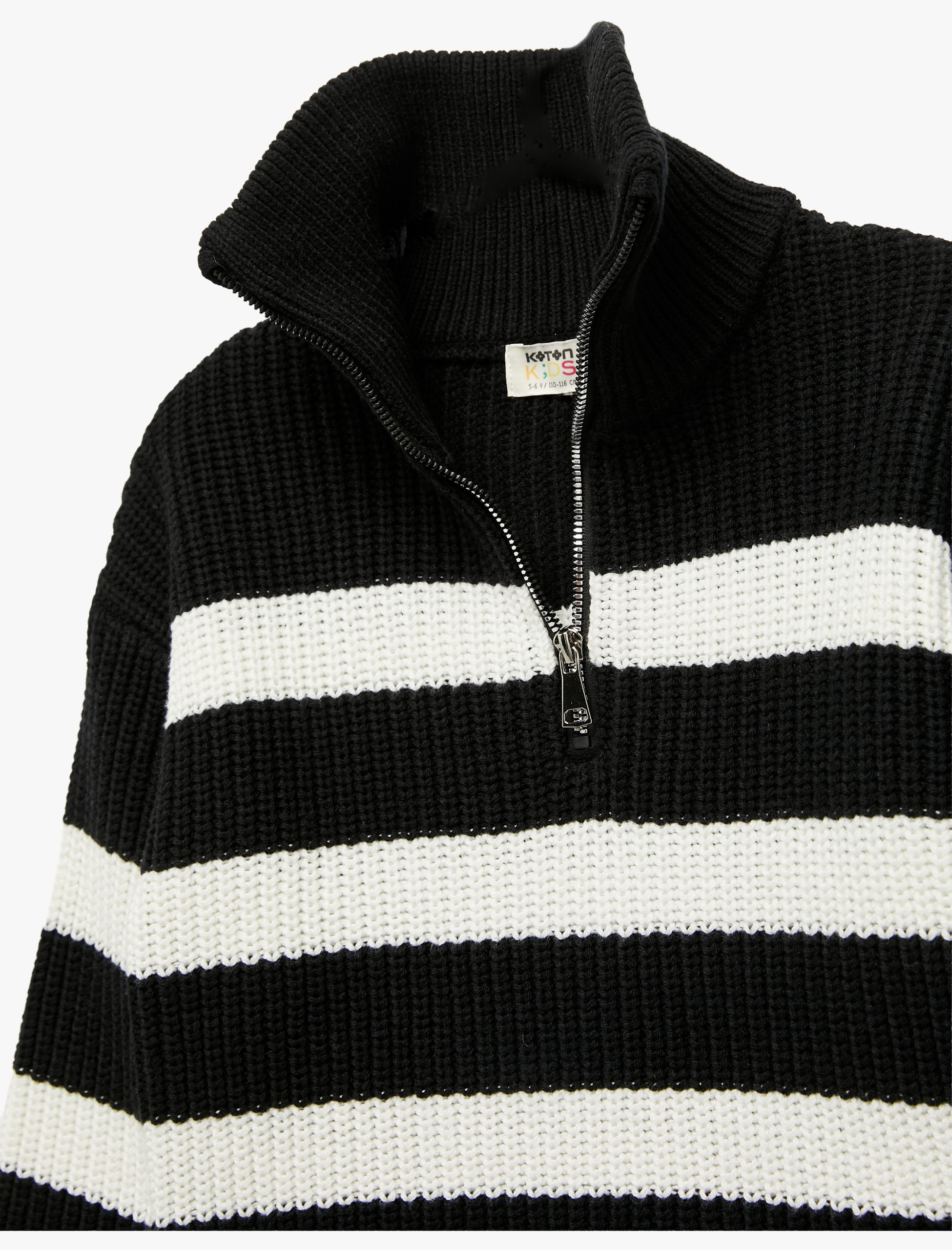 This knit sweater with zipper detailing offers a stylish and practical choice for little ones. With its long sleeves and high collar design, it provides extra protection on chilly days while its striped pattern adds a cheerful look. Its soft texture ensures children’s comfort all day long, and the zipper detail offers practical use.