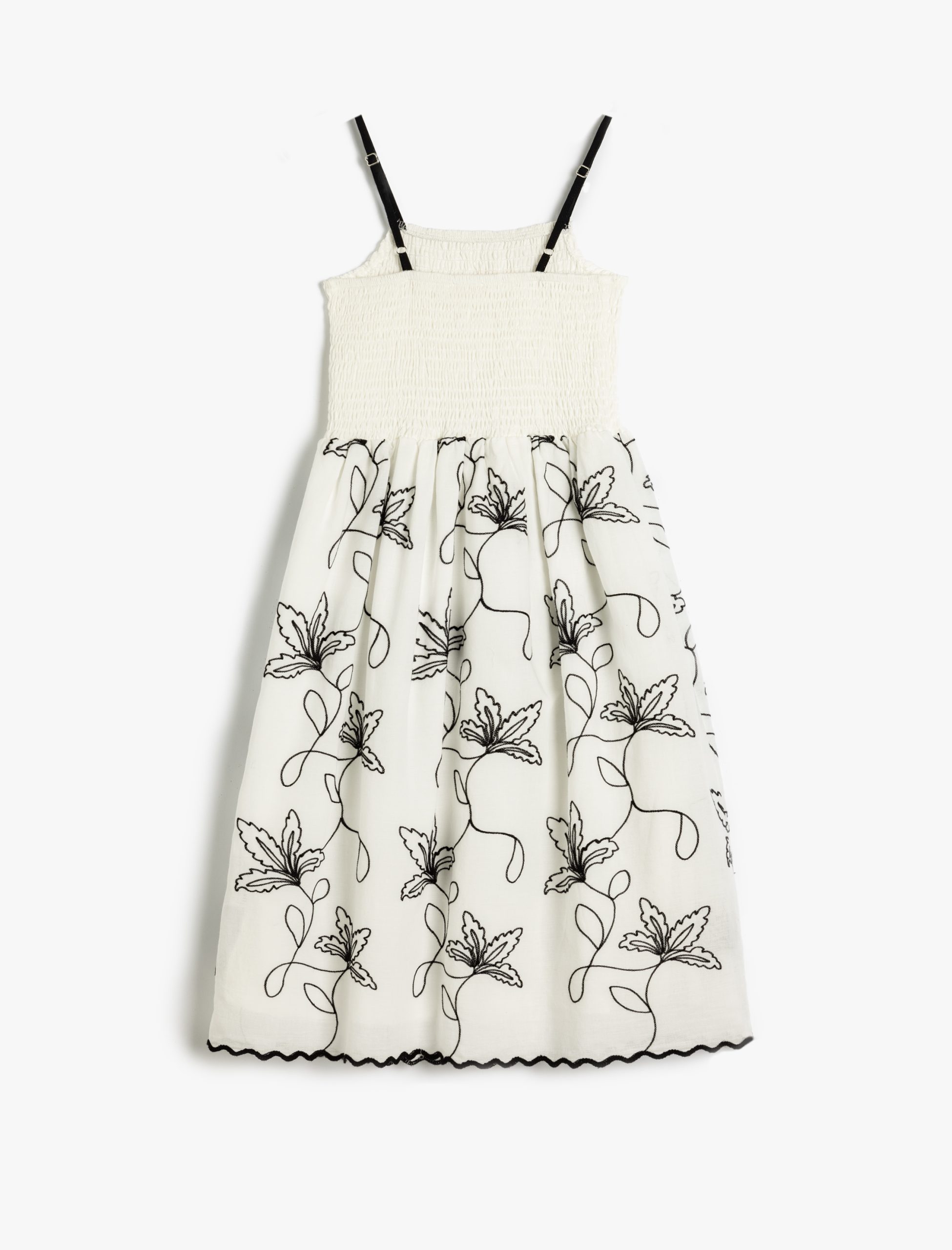 Girl’s Strappy Midi Dress with Frills and Floral Embroidery in Cotton