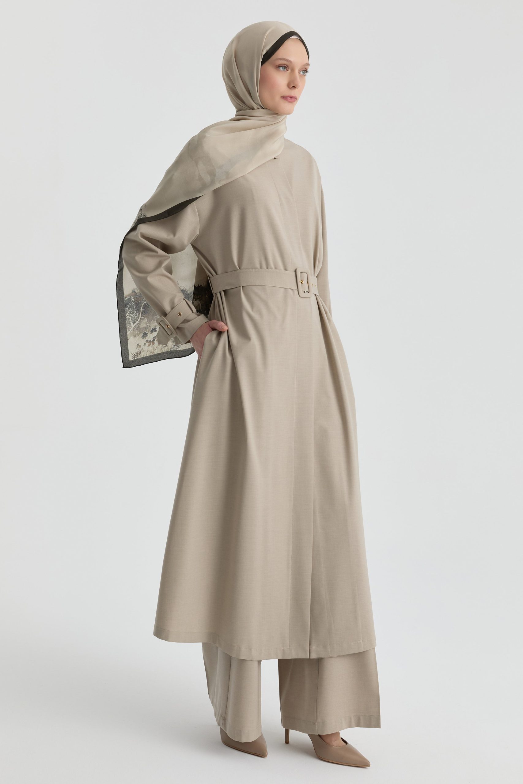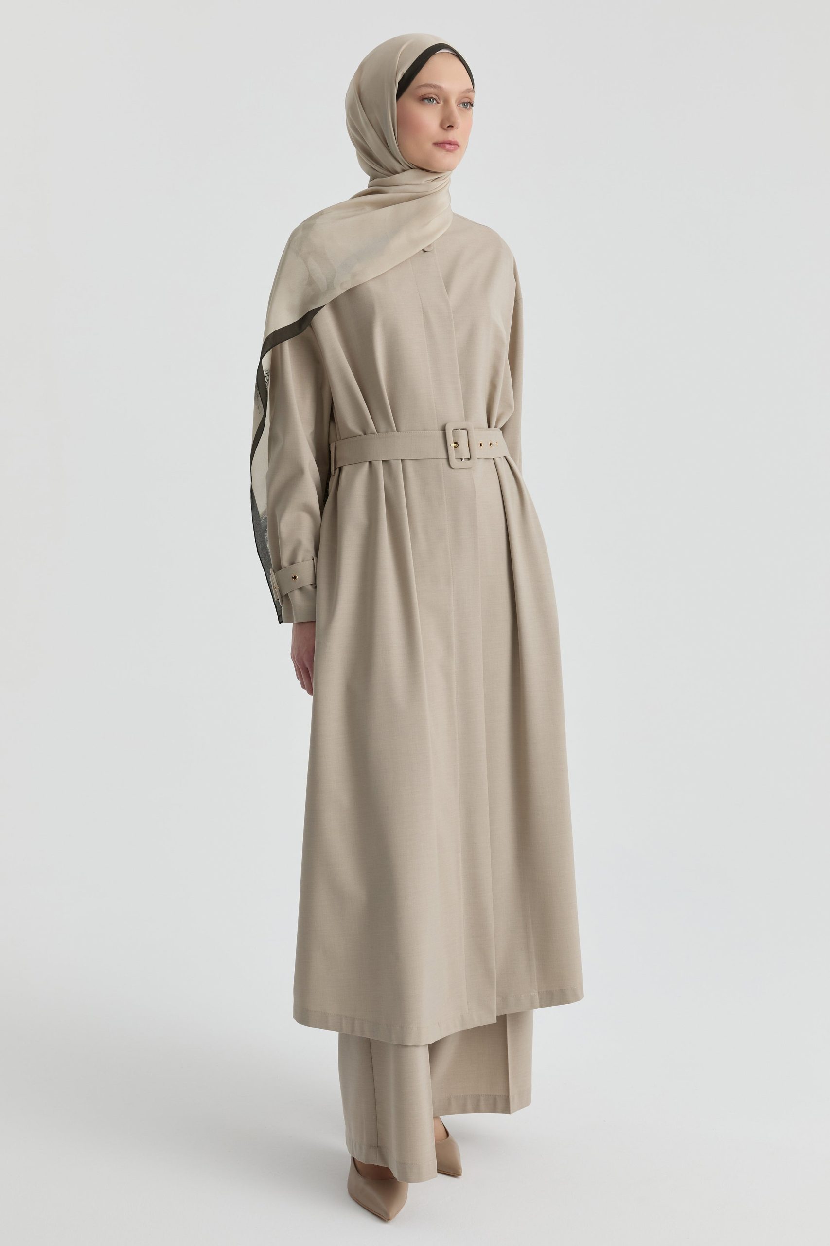 Gizli pat detayıyla sade ve düzenli bir görünüm sunan bu ferace, temiz çizgileriyle zamansız bir duruş sergiler. Ön kapamadaki gizli yapı, parçaya bütünlüklü ve akıcı bir form kazandırır.