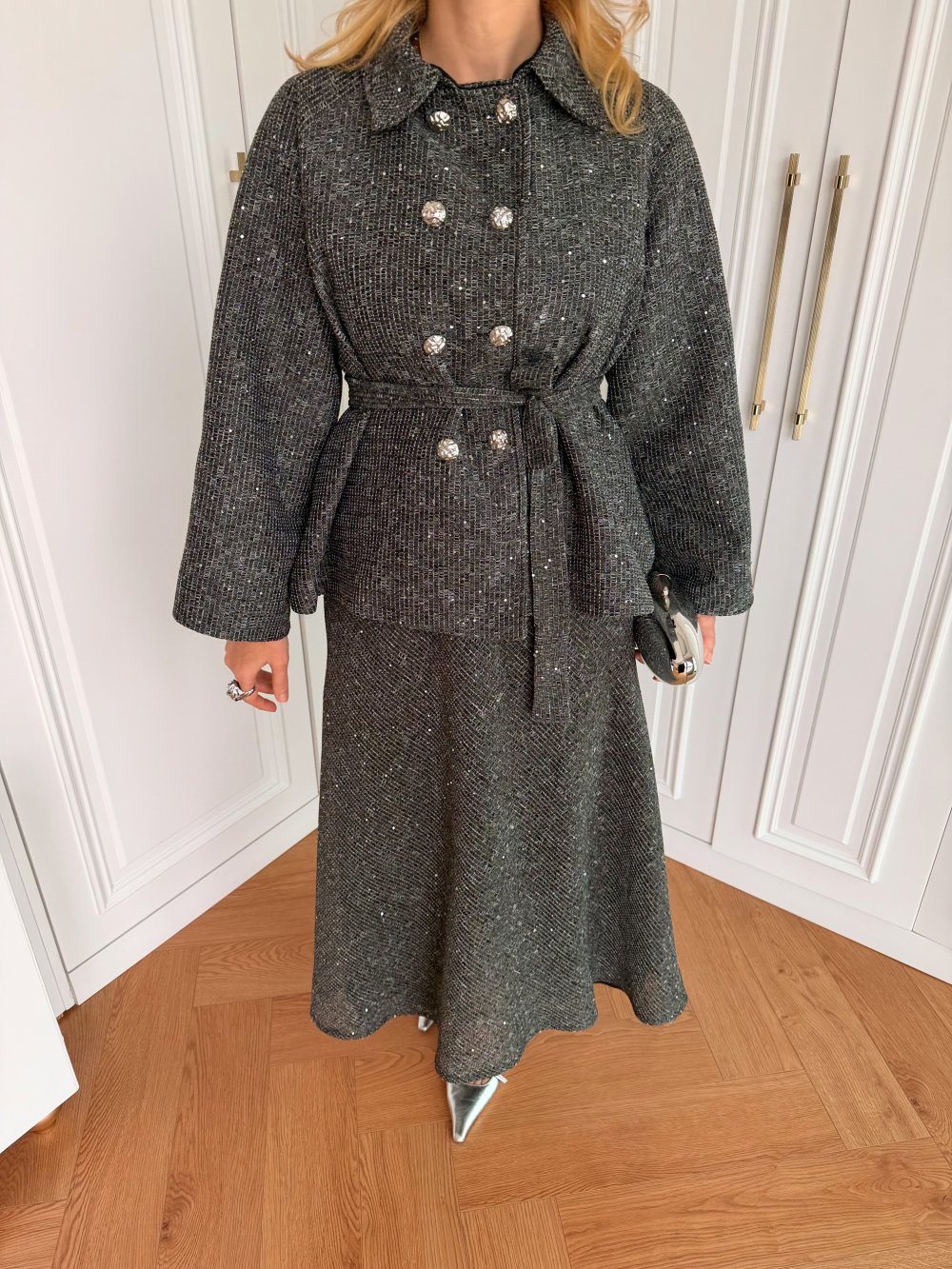 Tags: detachable belt, dropped shoulder, elastic skirt, fashion set, gray outfit, sequin details, suede fabric, wide sleeves, women's clothing